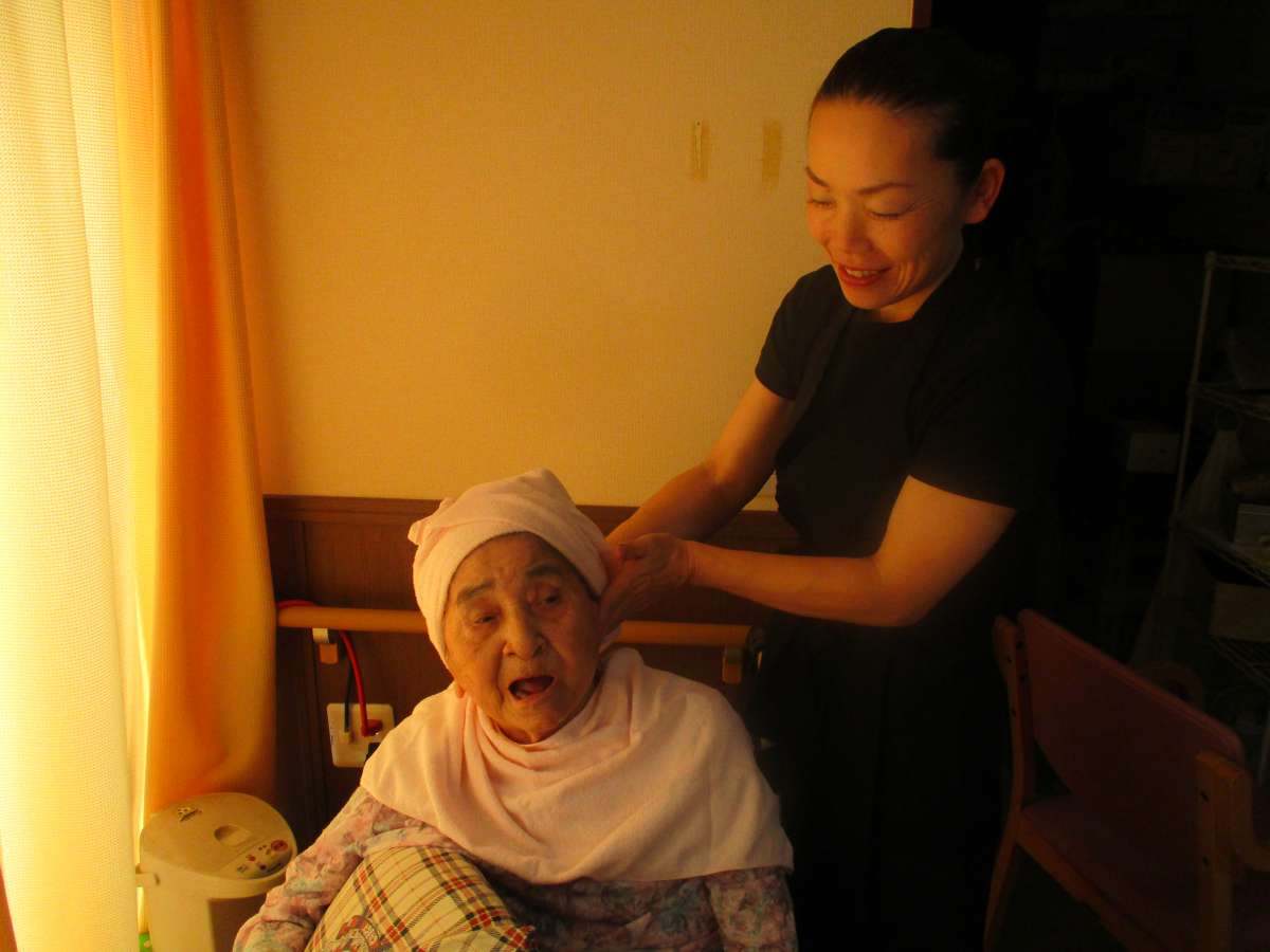 この日は男性のご利用者様がお顔のマッサージを気持ち良さそうに受けて