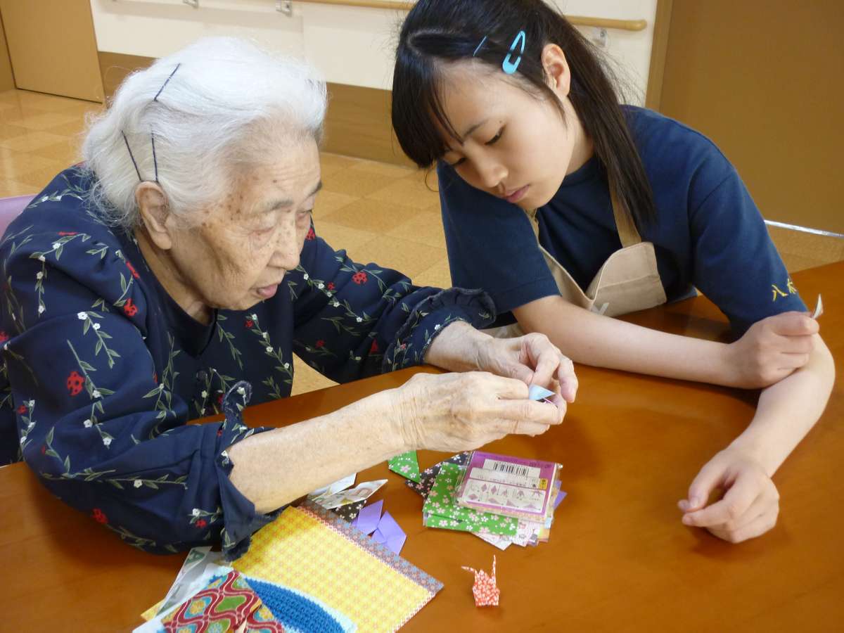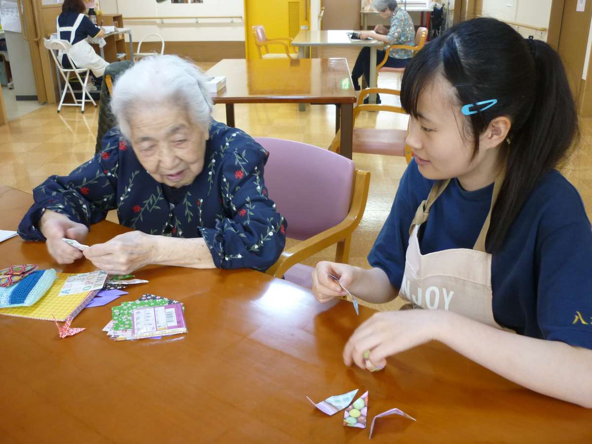 ご利用者様が、実習生さんに折り鶴、風船を教えながら、一緒に作られています。