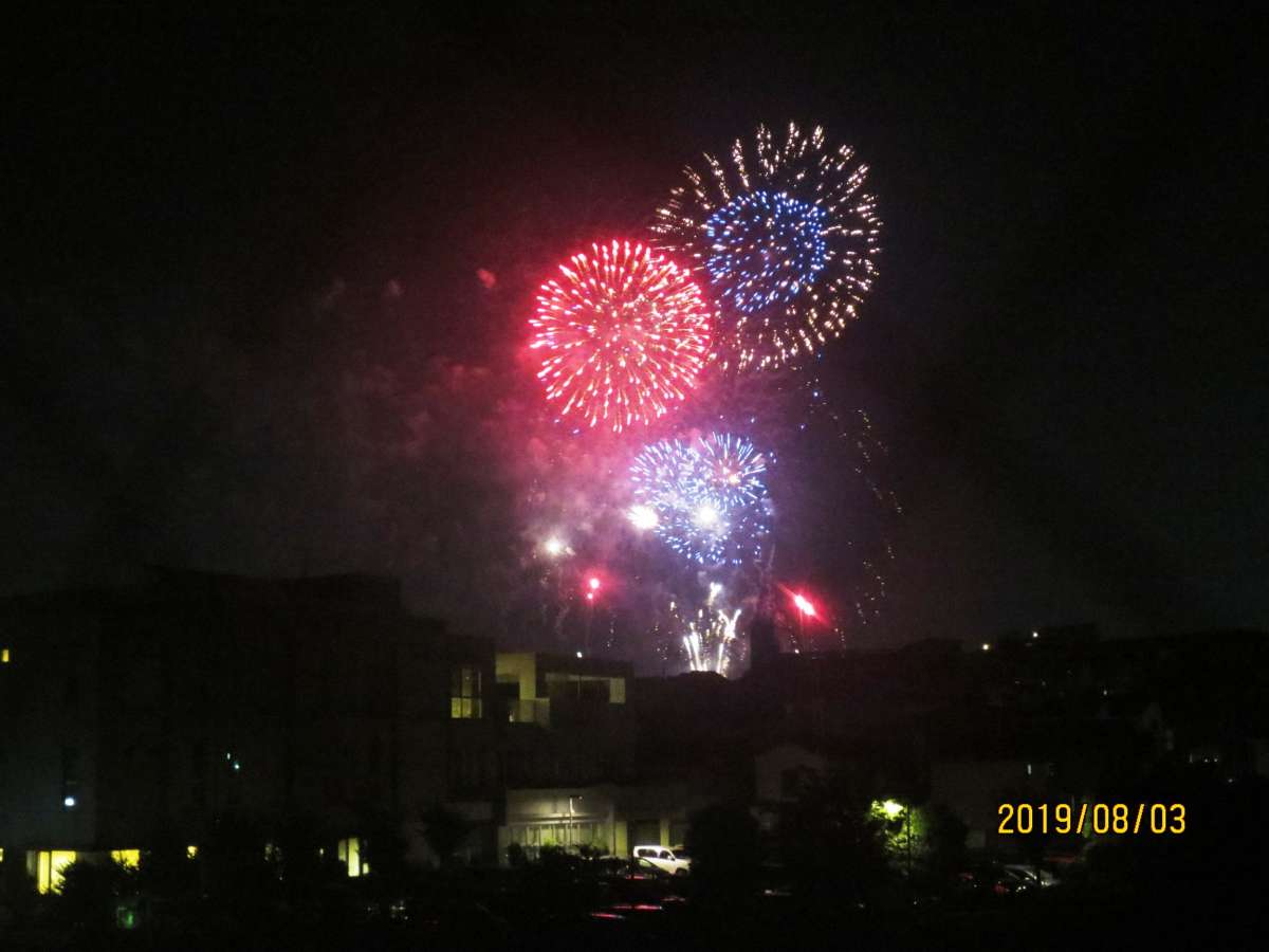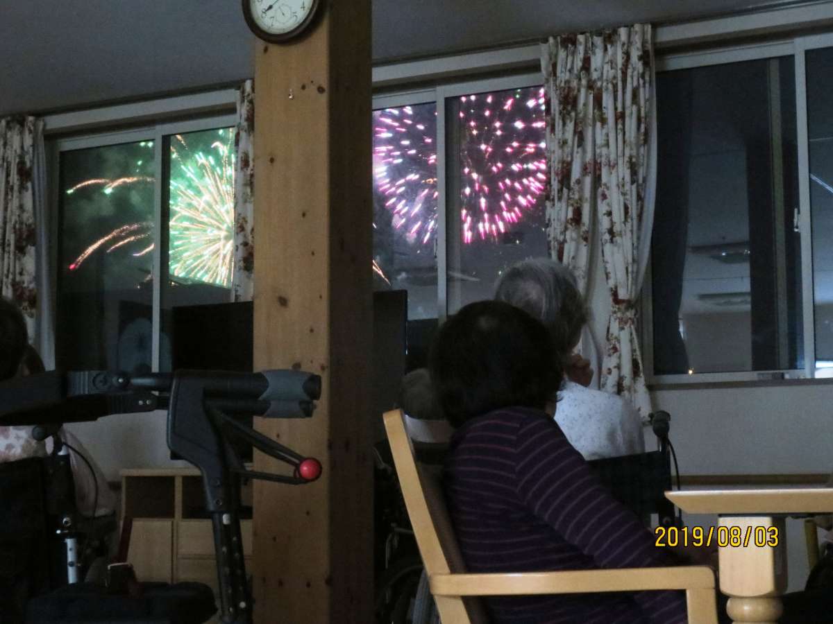そんな猛暑の8/3夜、朝霞市「彩夏祭」の打ち上げ花火を 毎年恒例でありますが、施設のご利用者様方々、ご家族様と スイカを食べながら鑑賞しました。