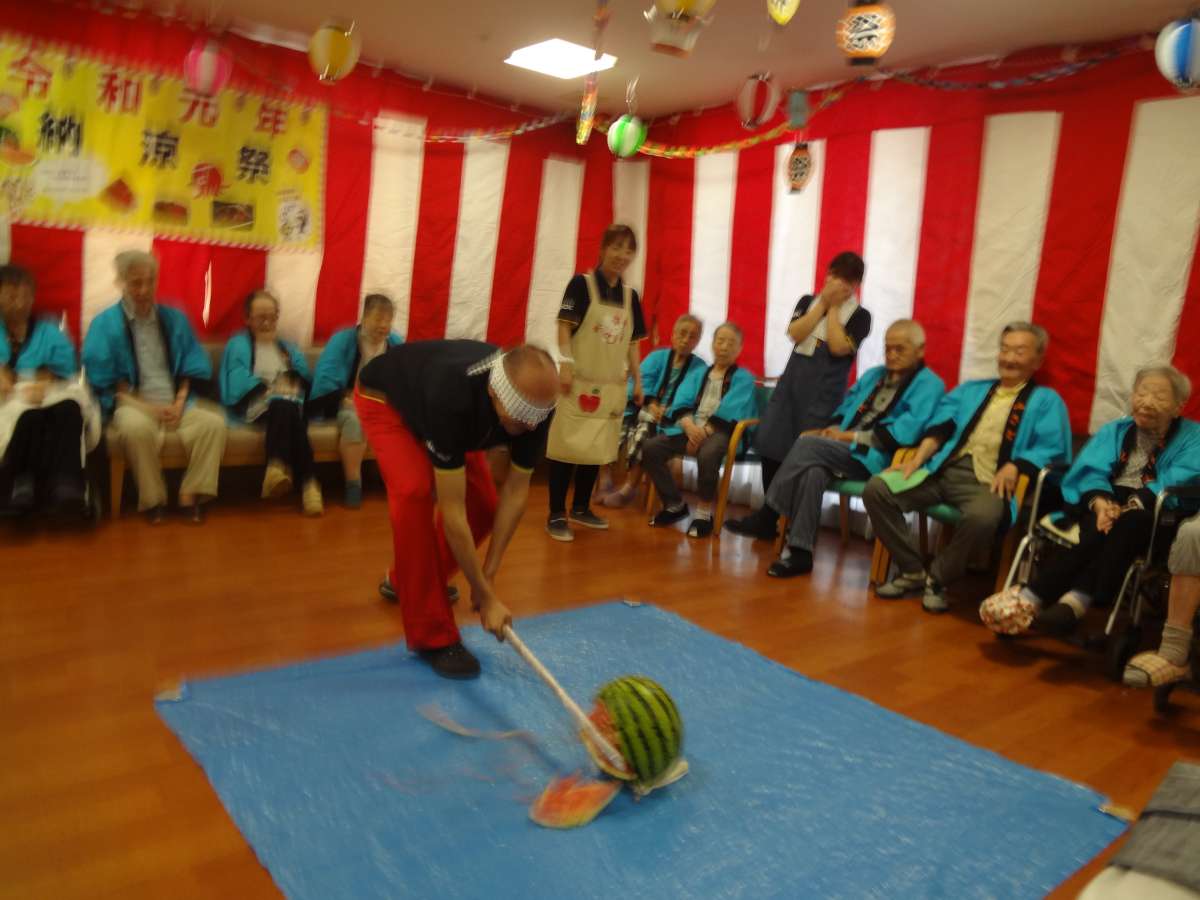 今年のスイカは昨年より大きくて、なかなか割れませんでした~何人目で割れたでしょうか?ご利用者様のご家族様も参加して頂き