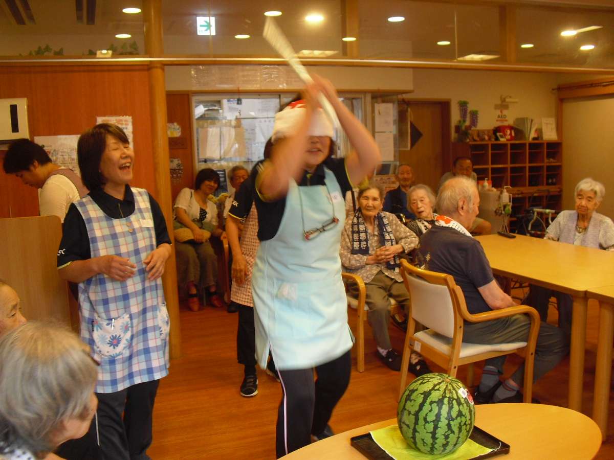 | 皆様こんにちは、 グループホーム みんなの家・岩槻本町です。 8月19日(日)に岩槻祭りがありました(*^。^*) 暑い夏ですが屋台や歌声などが聞こえてくるとウズウズして外に出たくなりますね♪ ホーム内では家族会もおこない、皆様とスイカ割りも楽しまれスタッフも頑張ってスイカを叩いてました! その後は、美味しく頂きました♡ |