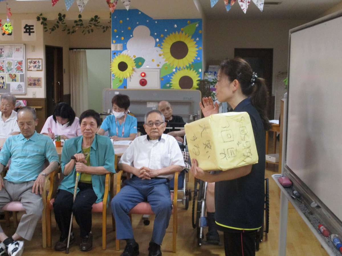8月17日は<サイコロゲーム>を行いました☆何が出るかドキドキしながら、おそるおそるサイコロを振っていました!(^^)!“大笑い” “早口言葉” “昔話”などなど・・・(^◇^)ご利用者様の素敵なお話もたくさん聴けました❦来週は外食会やALSOKあんしんヨガ、歌謡ショーなど楽しいイベントをまだまだたくさんご用意していますので、是非見学・体験利用にお越しください★デイサービスセンター遊・川越南大塚一同お待ちしております♪