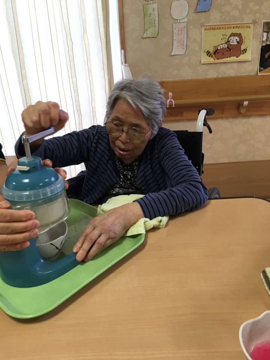 みんなで交代しながらかき氷機を一生懸命周し、イチゴのシロップをかけて美味しく頂きました。