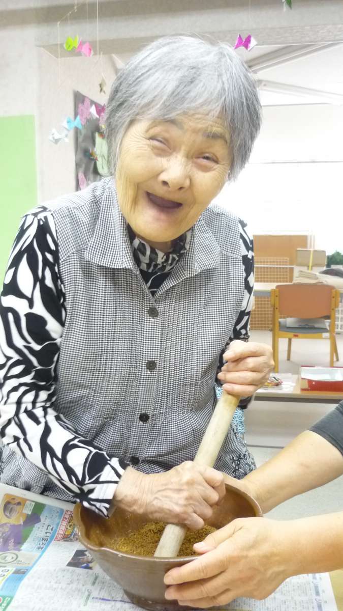 ベテラン主婦の女性陣に一生懸命、すり鉢ですってもらいました。
