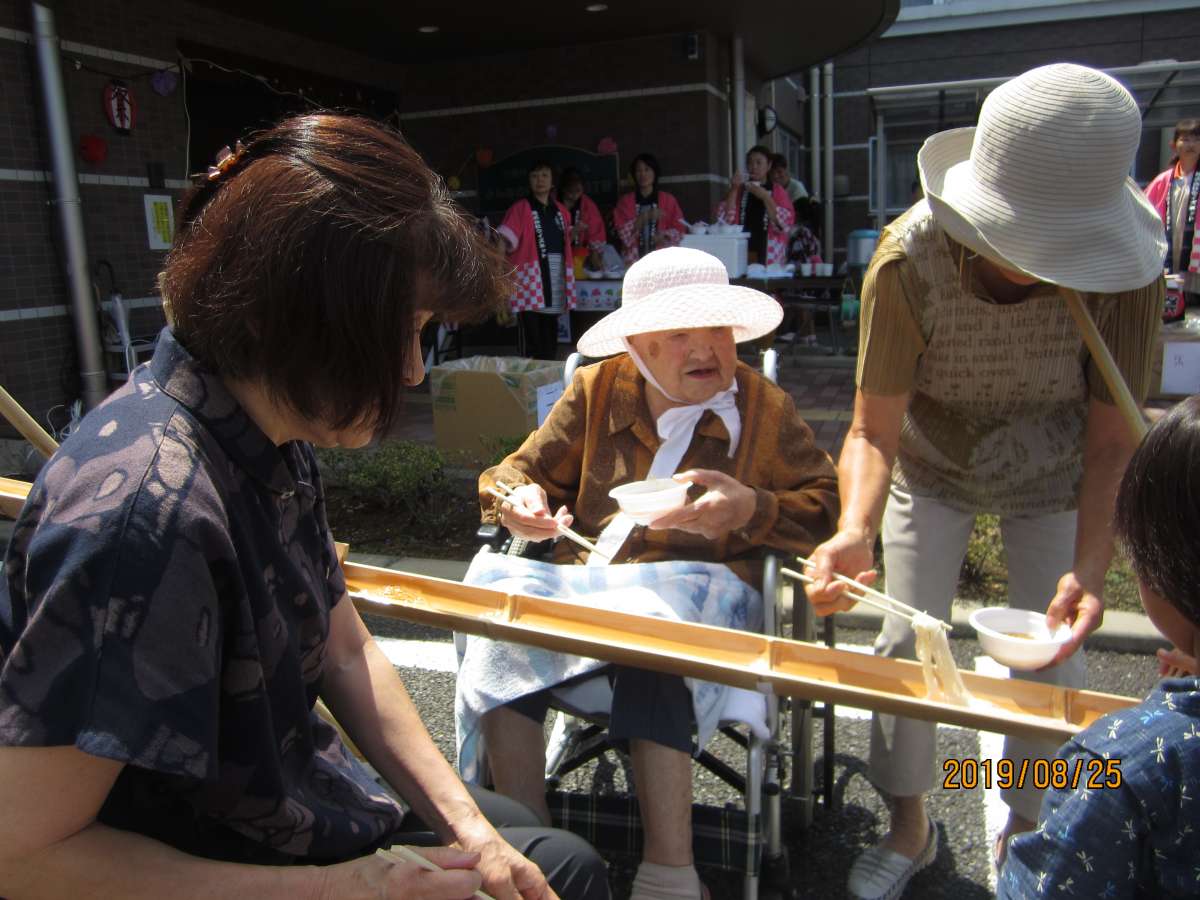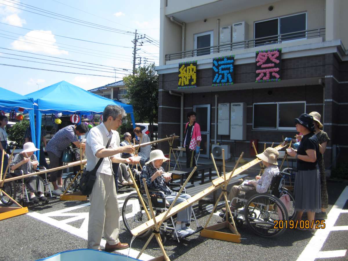 こんにちは 介護付き有料老人ホーム『みんなの家・三橋6丁目』では日曜日に『納涼祭』を行いました(^O^)お天気にも恵まれ☀ 外では三橋6丁目名物『流しそうめん』に『かき氷』\(^o^)/その他『綿あめ』『チョコバナナ』と盛りだくさん♪ 子ども達によるすいか割も行われ盛り上がりました~