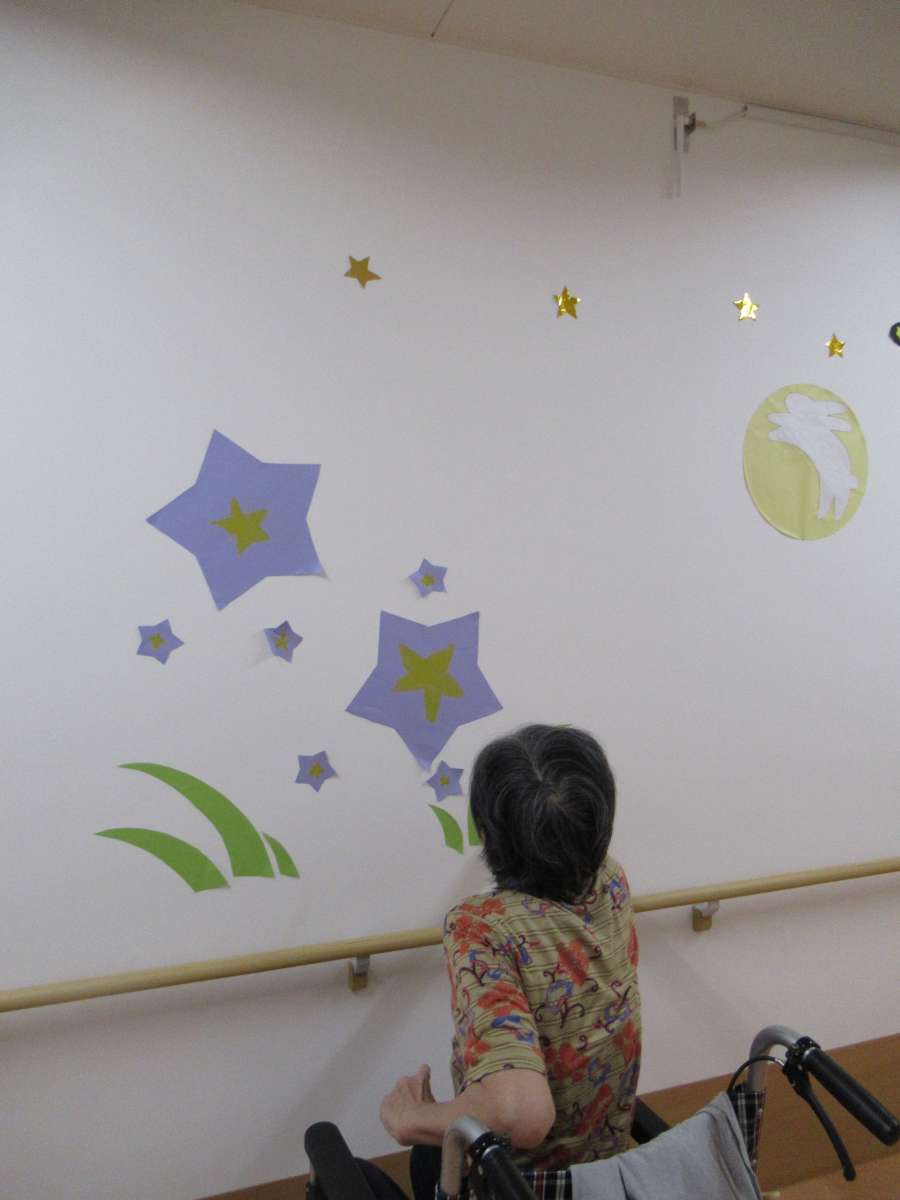 お月見の中にウサギを貼り桔梗の花の中を器用に塗りつぶし飾りつけをしていただきました♥