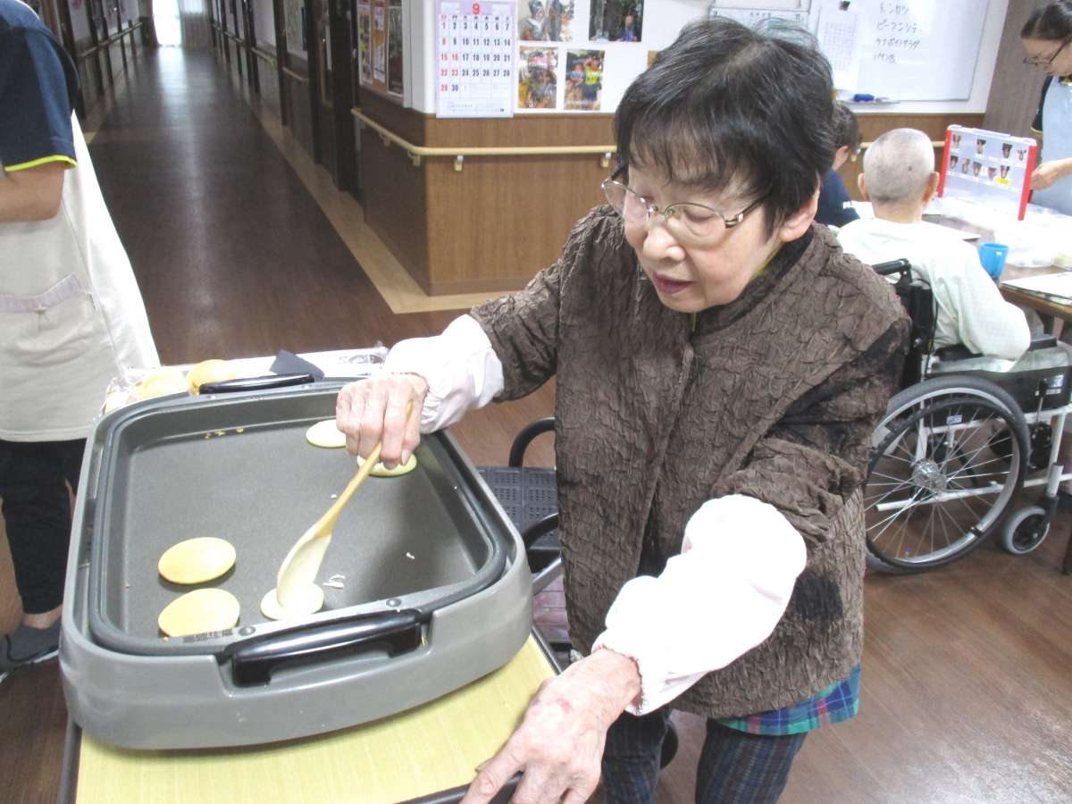 敬老の日は、お祝いの後に職員さんといっしょにどら焼きを作りました。