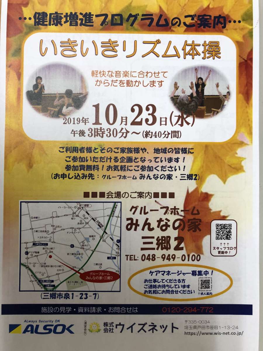 こんにちは!みんなの家三郷2です。10月23日(水)15:30~(40分間です)「健康促進いきいきリズム体操」が