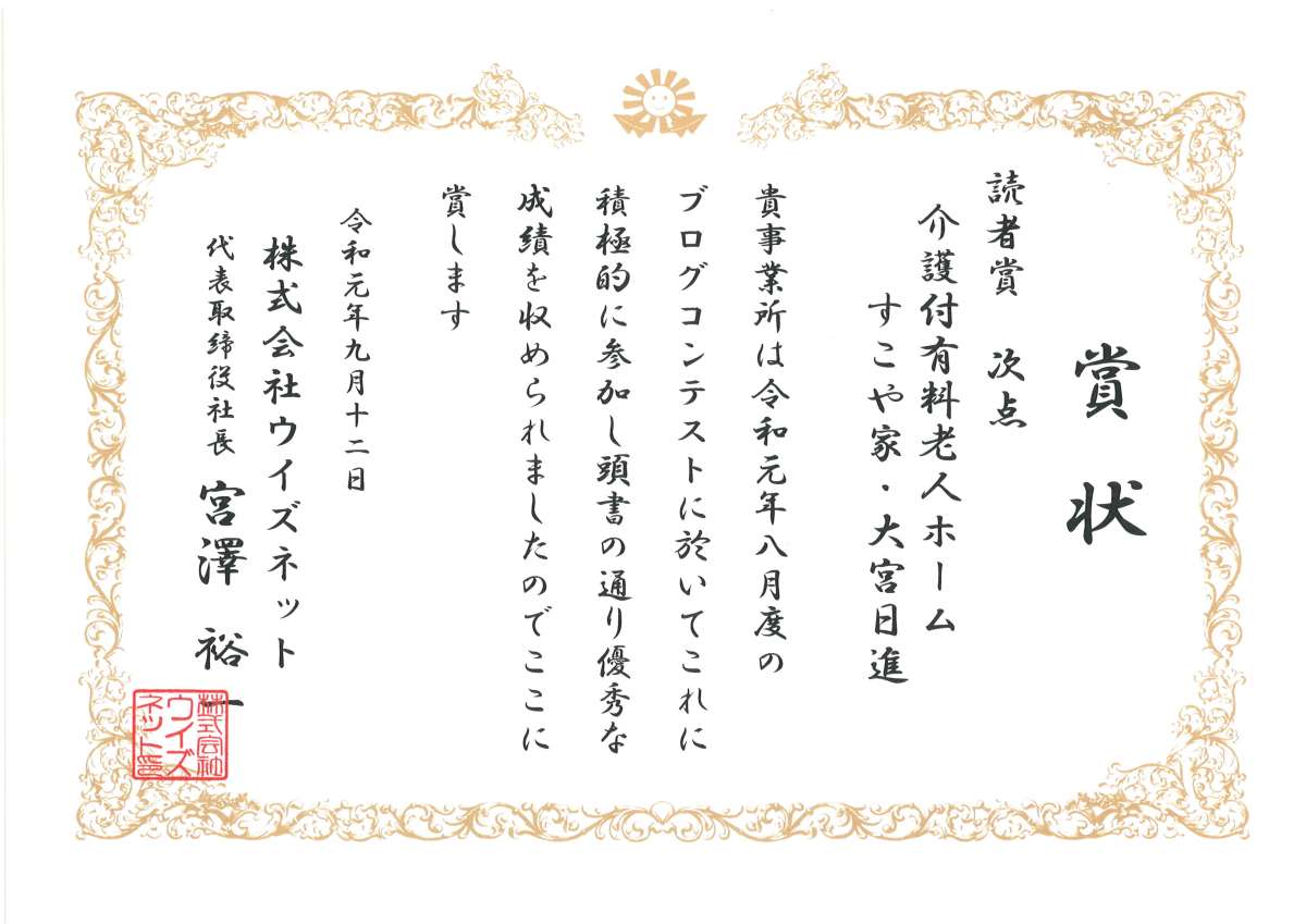介護付有料老人ホームすこや家大宮日進の8月のブログが、8月の社内のコンテストで読者賞・次点を頂きました。