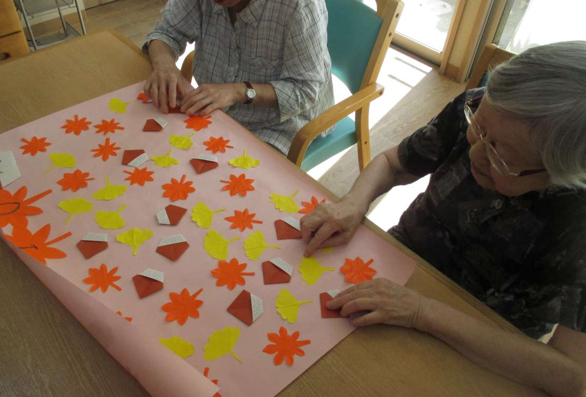 秋らしく、もみじやイチョウ、栗を折り紙で表した作品です^^