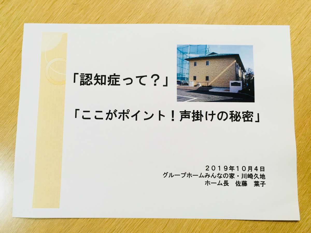 10月4日に川崎市高津区内に居住されている家族介護をされている方を対象に、子母口いこいの家にて「・認知症って?・ここがポイント!声かけの秘密」と題しましてお時間を頂戴して、お話をさせて頂きました。