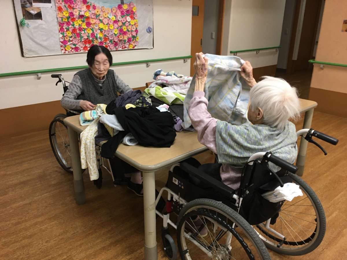 スタッフが洗濯物を畳んでいると