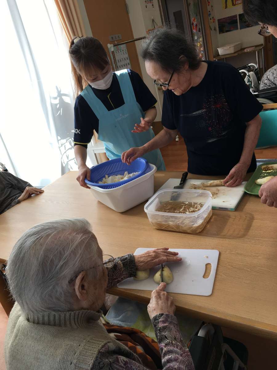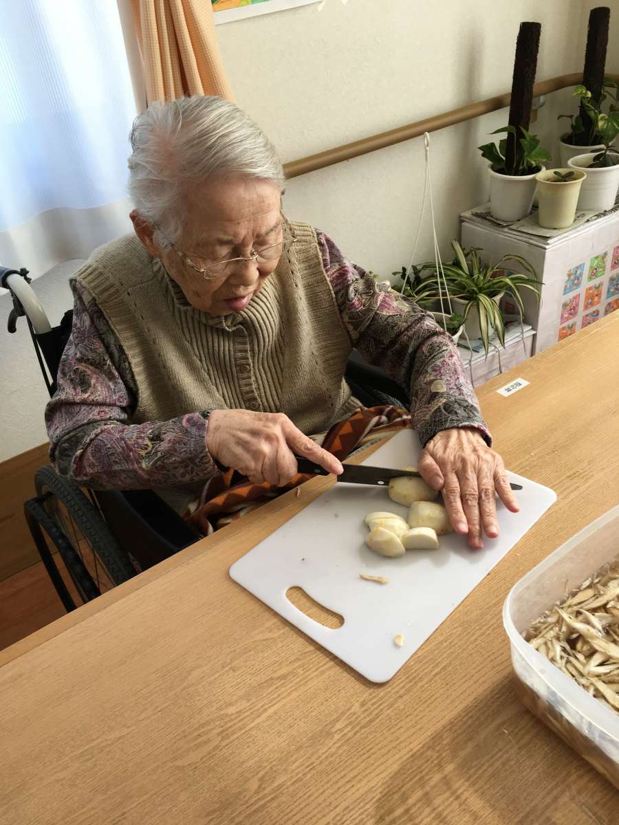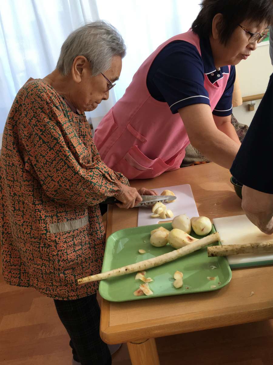 こんにちは!みんなの家三郷2です。ブログをご覧頂き有難うございます。11月10日は三郷2で、秋の収穫祭として「芋煮、焼き芋」をやりました。この日は最高の秋晴れで寒く無く暑くもなかったです。毎年、秋の収穫祭では室内で焼き芋やトン汁を召し上がっていましたが、焼き芋の炭を起こしていたらホーム長が焼き芋の様子を見にきてくださいまして、今年は外で皆さんと食べましょうと声をかけてくださいました。嬉しかったです。急遽会場を変更して他のスタッフに伝え、椅子、テーブルを玄関外に設置準備完了!今年も、ご家族様も来設され皆さんと「焼き芋、トン汁」を召し上がりました。野菜と肉はスタッフと利用者様と一緒に仕込みしましたよ!男性の利用者様も包丁裁きは、おてもの