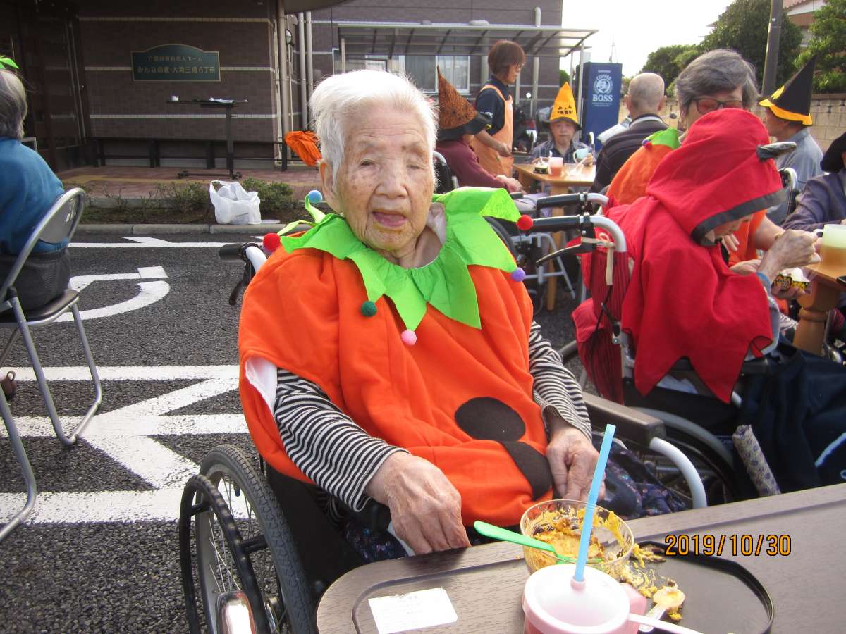 こんにちは 介護付き有料老人ホーム『みんなの家・三橋6丁目』です。10月の終わりの行事といえば~ハロウィン!!もちろん三橋6丁目でもやりました!ハロウィンパーティー♬ 皆さん思い思いの仮装をして~お外でおやつを頂く!もちろんおやつはハロウィンケーキ(#^^#)こんなおいしいおやつがたべれるなら毎日パーティーならいいのにね(^_-)-☆