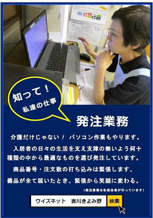 ご入居者(ご利用者様)が日々の生活に支障の無いよう、各担当職員がパソコンにて発注業務を行っております
