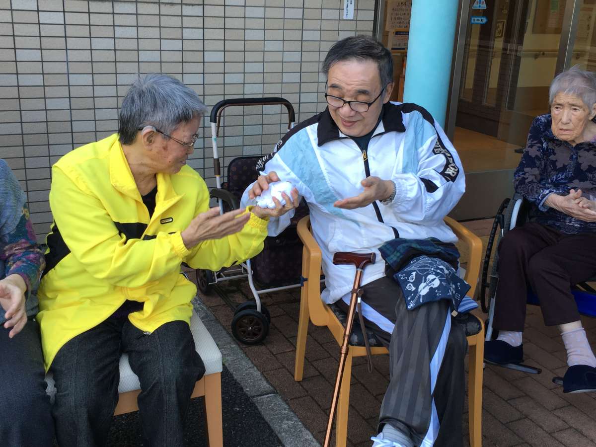 15日に1階・2階合同で玄関先で外気浴レクを行いました。 20人以上の大移動!!ハンカチ回しをしながらの大合唱!! 楽しい時間を過ごしました(*^_^*)