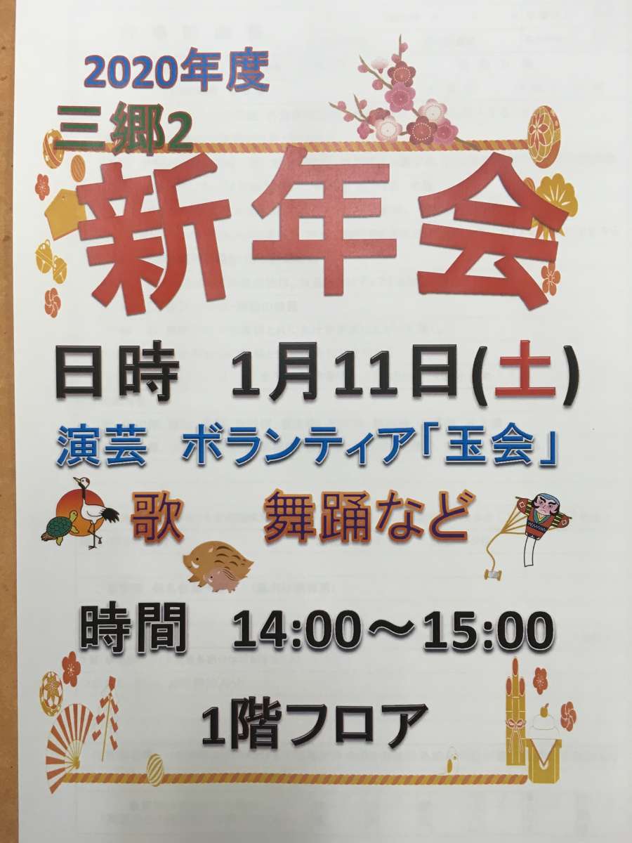 こんにちは!みんなの家三郷2です。ブログをご覧頂き有難うございます。今年も後わずかになりました。三郷2今年の行事クリスマス会が最後になりました。利用者様と一年の思い出が沢山できました。あっという間にですよね~さて、2020年の新年会のご案内です。三郷2では、1月11日(土に新年会を開催します。毎年、演芸ボランティアで「玉会」の皆さんをお招きして歌や踊りをしてくださいます。今年の新年会もブログ担当の佐木崎も自前の和太鼓を出して踊りの時に披露しました。2020年の新年会も太鼓を叩きますので宜しくお願いします。三郷2の行事は超派手にやってます。ボランティアの方も衣装を着て歌に踊り凄い楽しい一日になります。かっこいい、お兄さんもいますよ~是非皆さんでお越しください。
