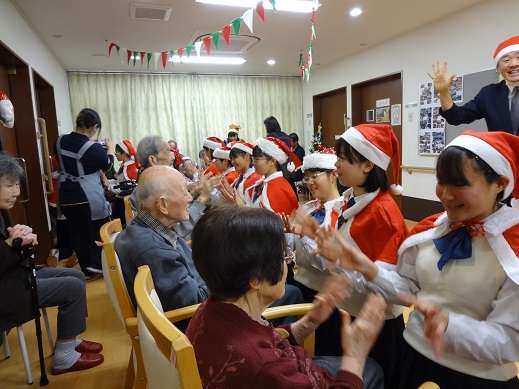 それから、入居者一人一人の正面に座り、幸せなら手を叩こうを手遊びしながら唄い、触れ合ってくれました。