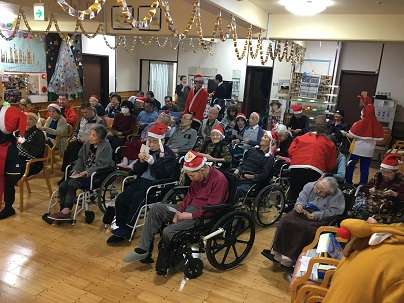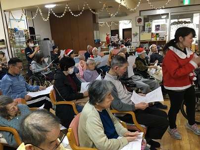 職員さんが密かに練習したハンドベルを披露したり、クリスマスソングをみんなで歌ったり、荒木施設長が「上を向いて歩こう」を歌ったり、、、