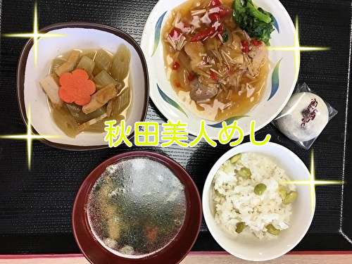 枝豆ご飯・きりたんぽ汁・鶏肉のきのこあんかけ・ふきの煮物・白まんじゅう