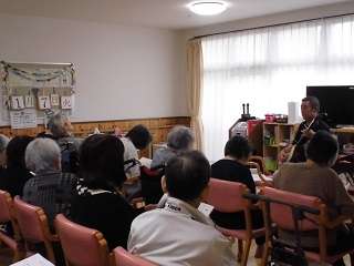 昼食後、ご利用者様たちに本館のホールに集まっていただき、ボランティアの演奏を鑑賞したり、演奏に合わせて、民謡や童謡の歌を唄ったり、楽しいひと時を過ごされました。
