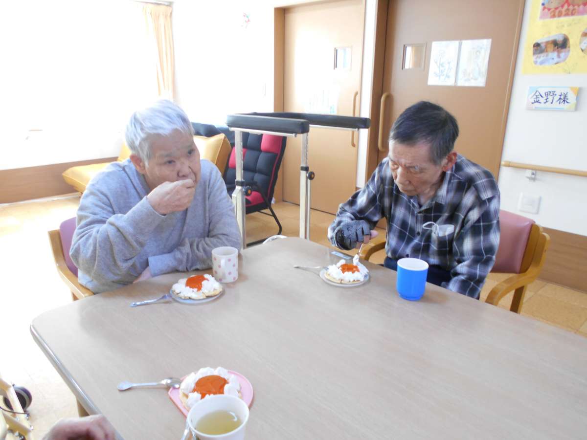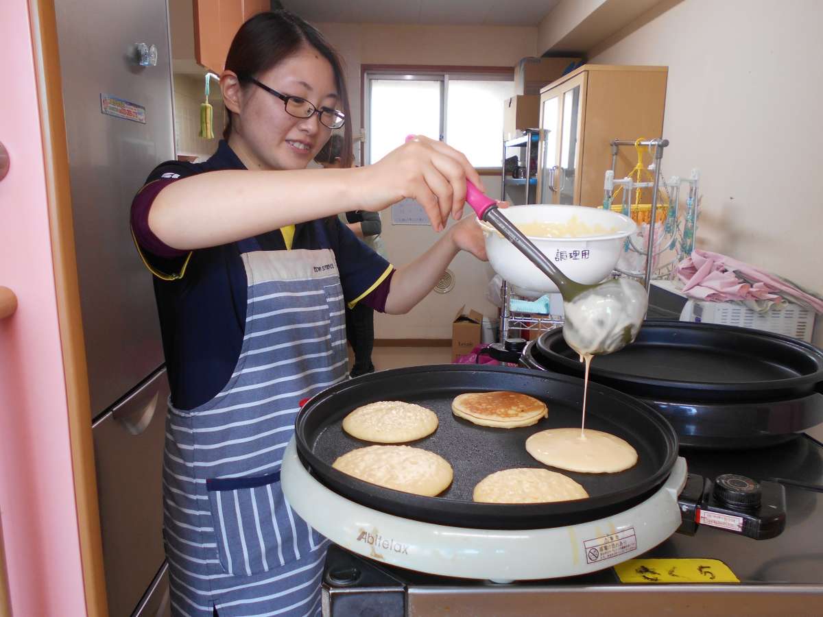今月は、若いスタッフの手作り・・・パンケーキにゼリーと生クリームをトッピング!!美味しそうなケーキの出来上がり( *´艸`)