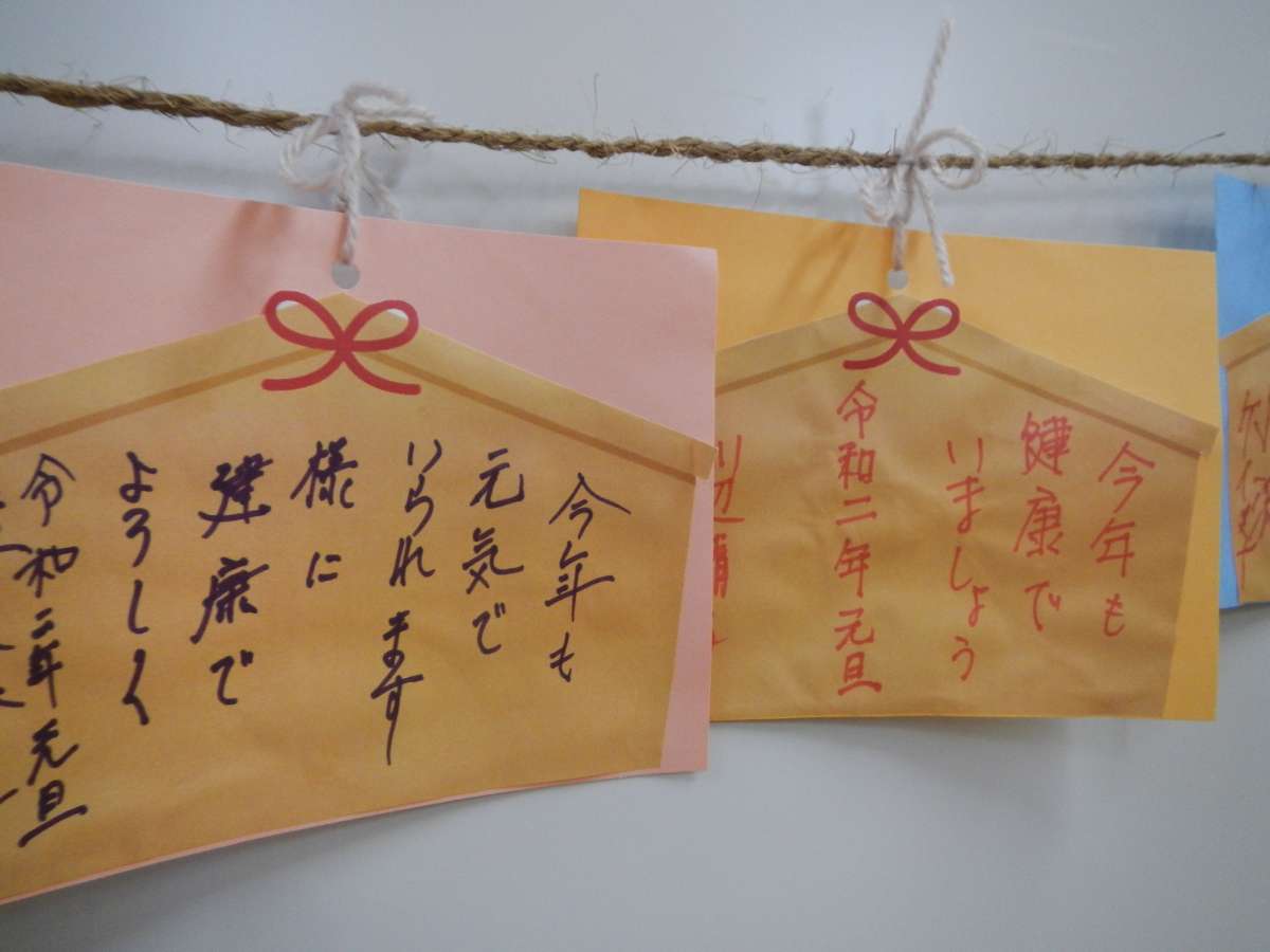 介護付有料老人ホームみんなの家・北本中丸では、お正月明け早々に、ご利用者様みなさんに絵馬に令和2年の想いを書いていただきました。 ※みんなの家神社の中のねずみもご利用者様の作品です。