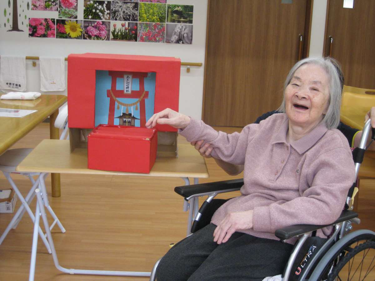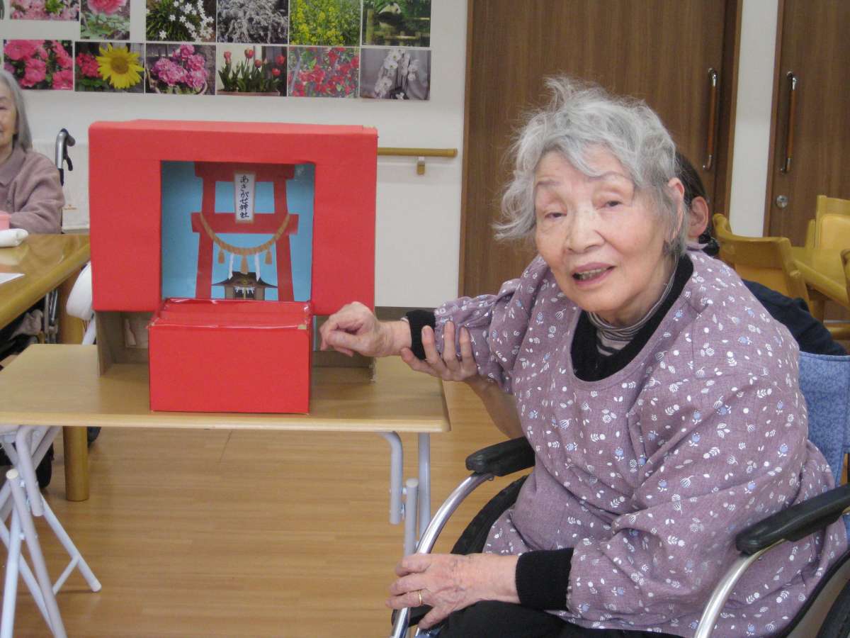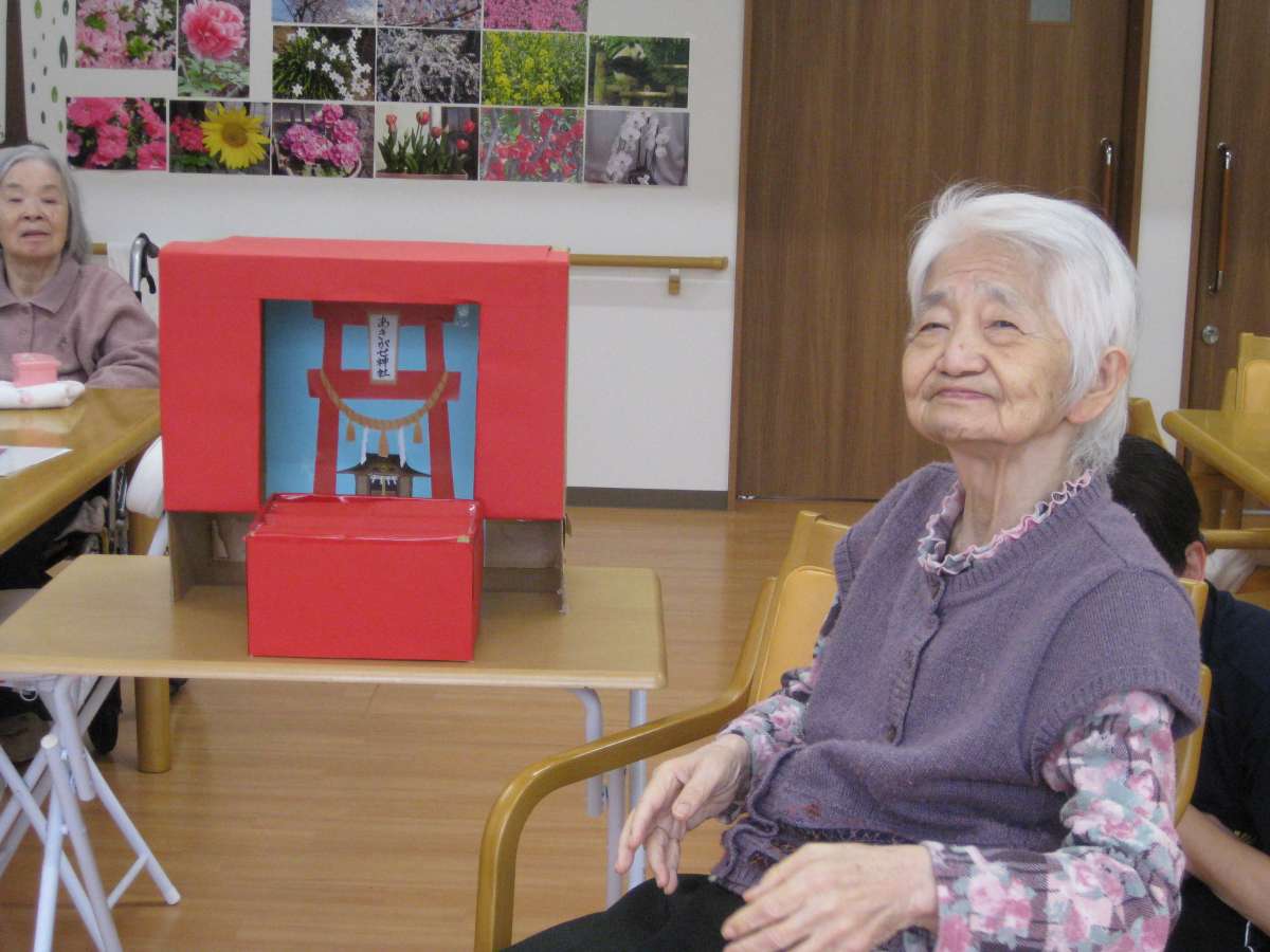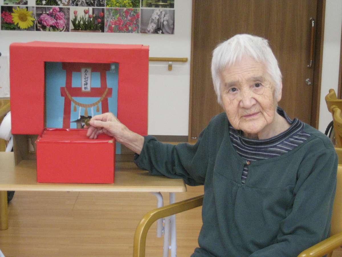 ホームで初詣を行いました。今年は寒さも厳しく体調を考慮してホーム(あきがせ神社)でお参りしました!! 皆何をお願いしたのかな・・・?? 『元気に過ごせますように! 体調に留意し怪我のないように楽しく毎日が送れますように・・・』 お聴きすると『昨年は色々あったから(笑)』と話されます。 どうぞ、神様に届きますように~ 今年1年が良い年でありますように・・・ 是非、グループホームあきがせに遊びに来てください、お待ちしています。