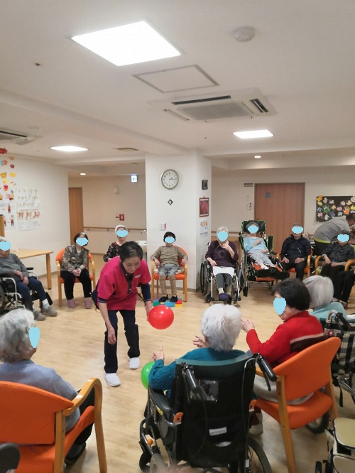 お客様には輪になってもらい、職員が中に入り、風船を落とさないようにお手伝いです🎈
