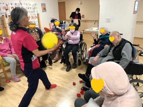 お客様2つの輪を作り、カゴに玉を投げ入れます!