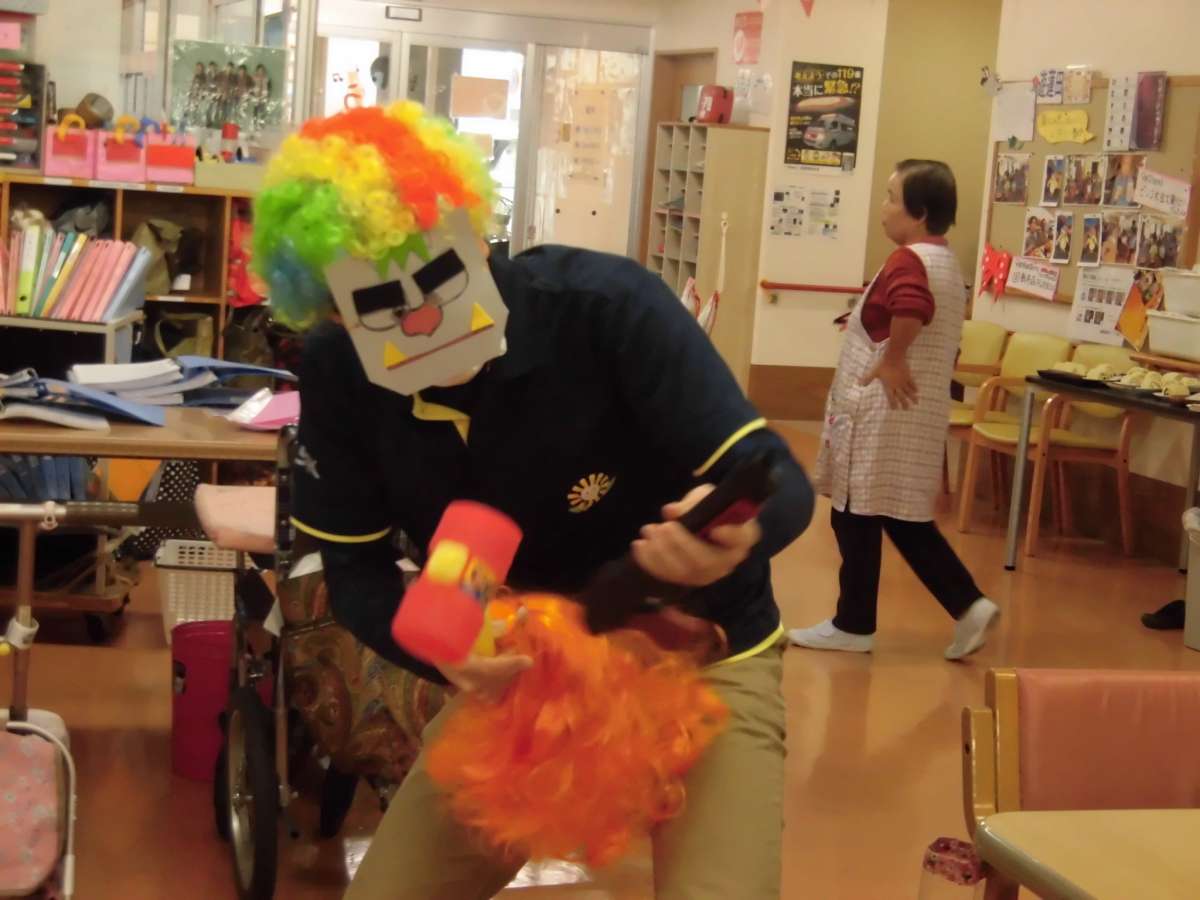 こちらは3時以降になりましたが、豆(新聞紙を丸めた物)を用意して、鬼が来たのでご利用者様皆様で「鬼は外ー!」と豆を鬼に向かってまきました!鬼を追い払って「福は内―」ですね?