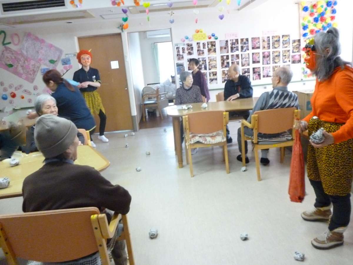 3階の皆様も大喜びで豆に見立てた新聞紙を投げ、鬼退治♪