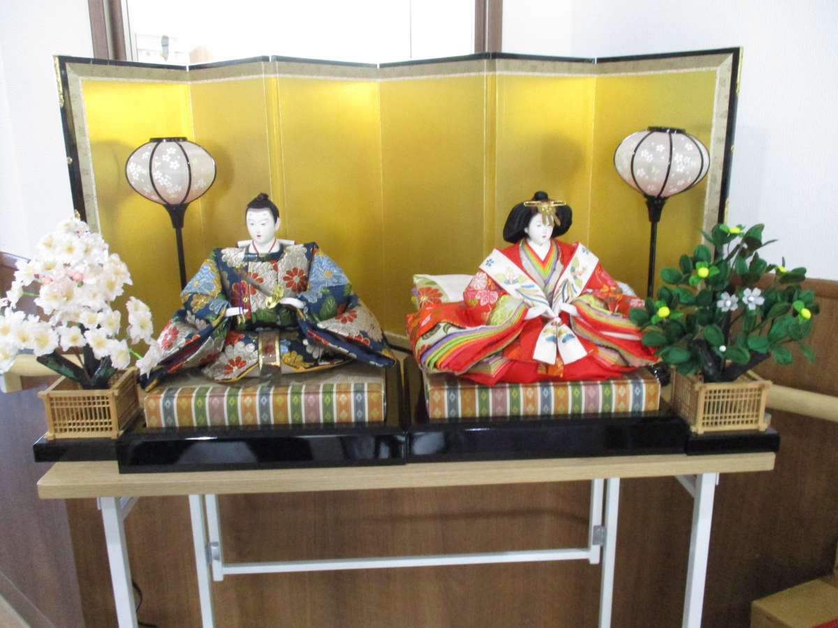 お雛様は、入居者様から提供して頂いたり、職員さんからお借りしたりした物です。