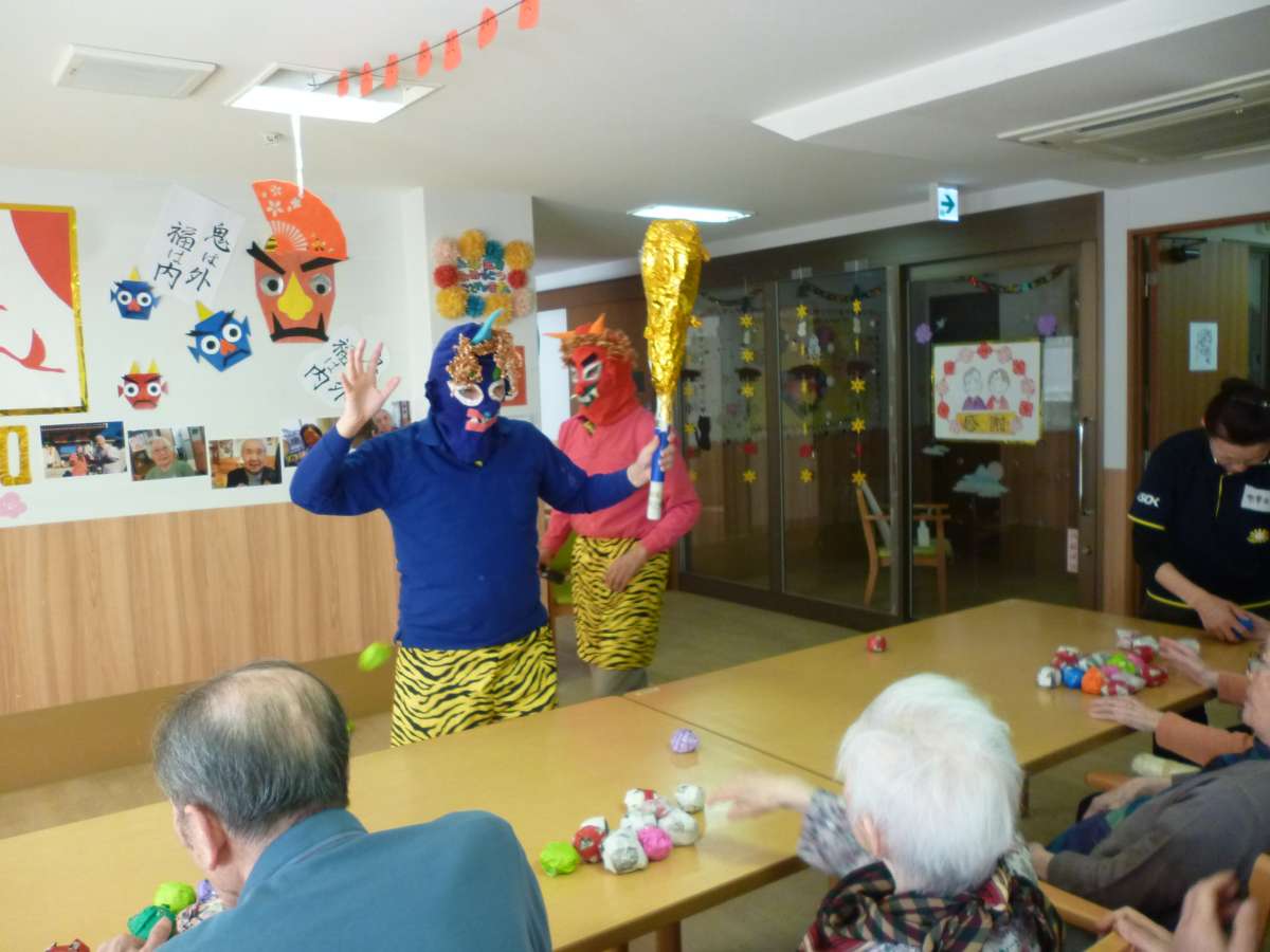 2月2日 節分の豆まきを行いました。鬼役の職員に向かって豆の代わりに新聞紙を