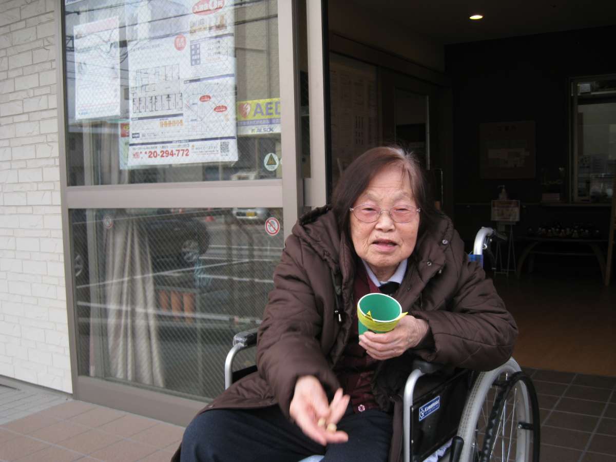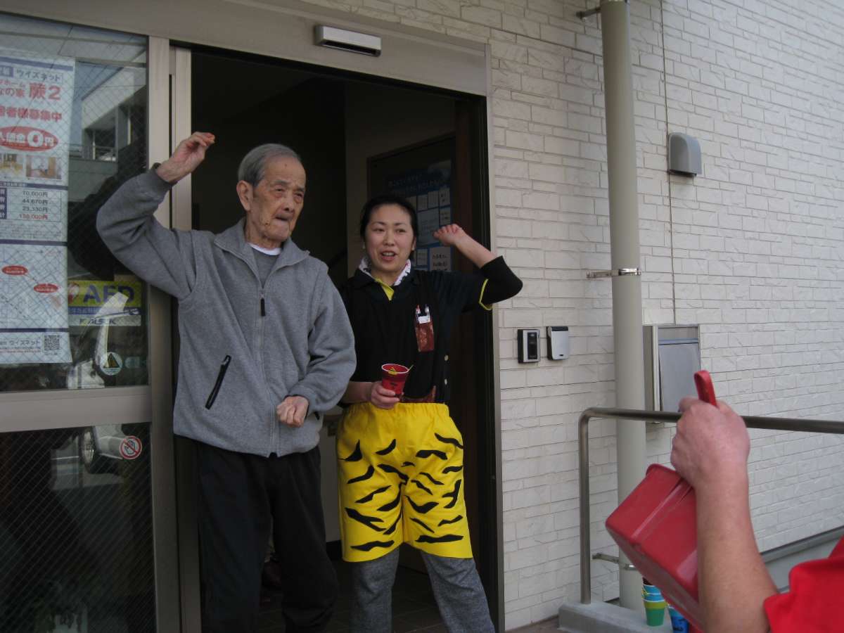 グループホームみんなの家・蕨2 の玄関先から、入居者の皆間で豆を 「えーい」。