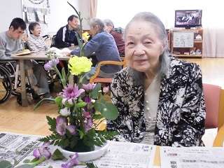 今回のイベントはいつもより多いご利用者様の参加がみられ、色とりどりの綺麗な花がテーブルの上に並べられ、春色の生け花をにこやかにされていました。
