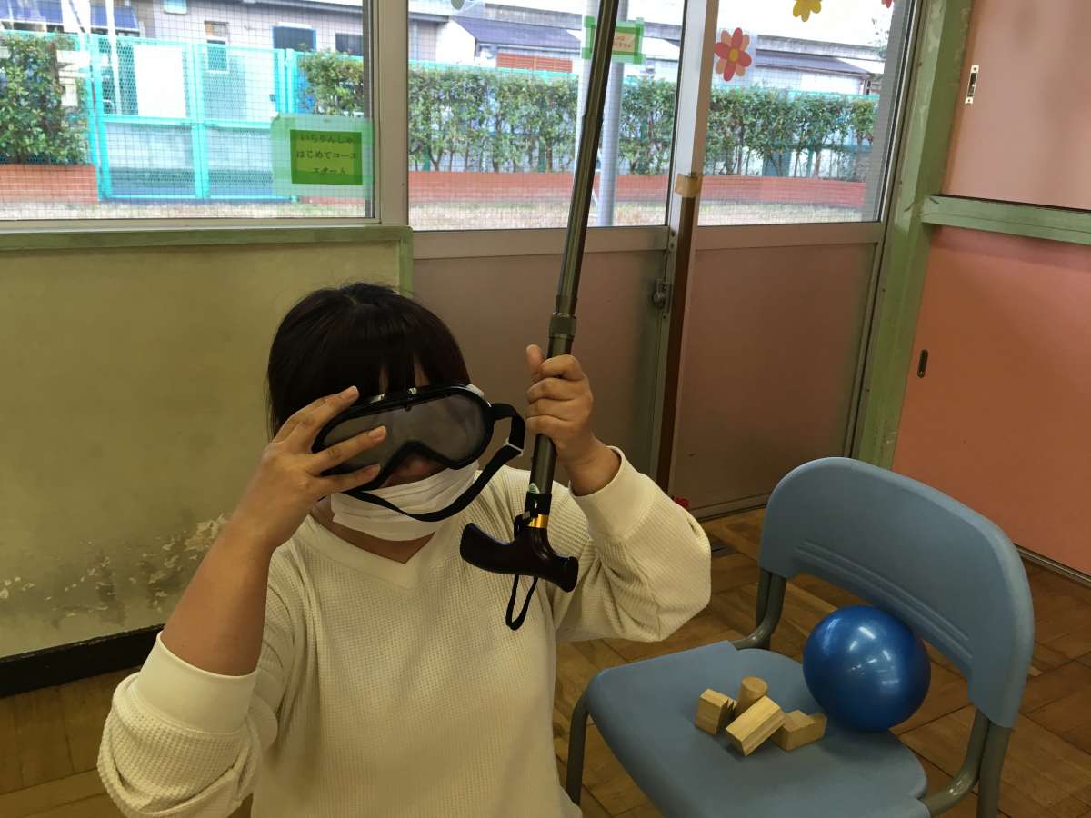 スタッフがお手伝いして子供たちに高齢者体験セットを装着します・・・