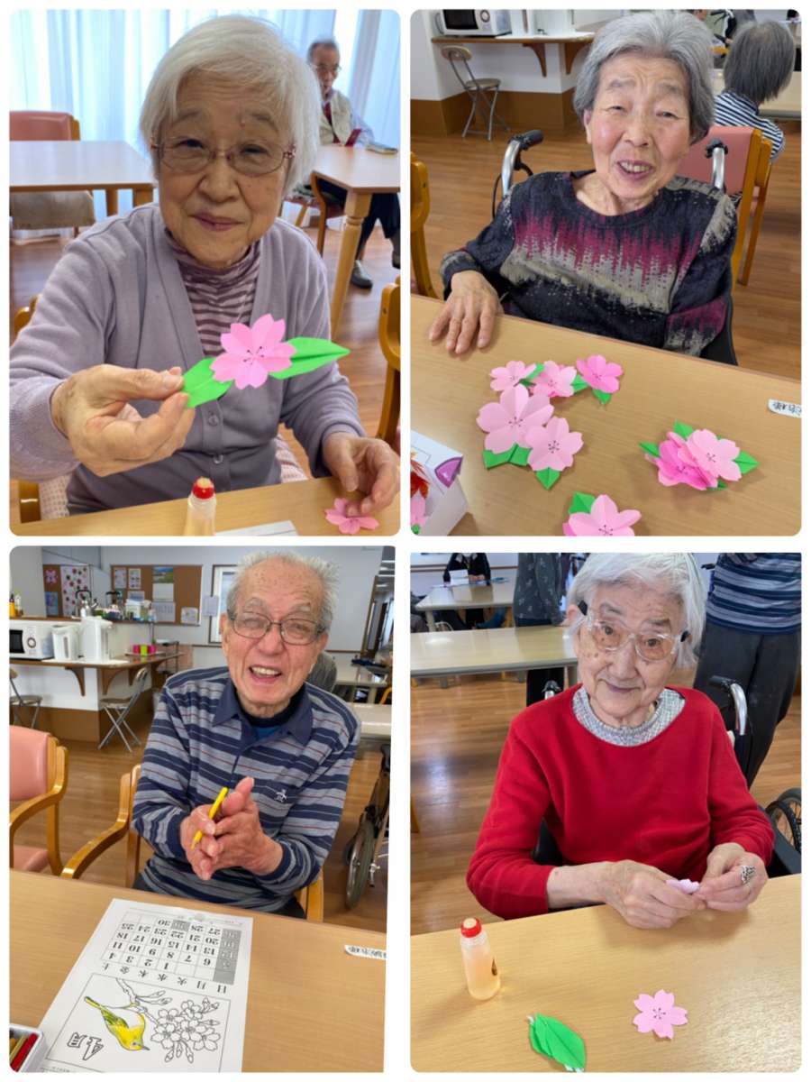 こんにちは。みんなの家・大宮内野本郷のコダマです(^。^) 花の丘公園そば。さいたま市西区。 宮原駅西口よりバス6分&徒歩4分のところにある施設です。 二階フロアでは、『4月のBIGカレンダー制作レク』を始めました(^。^) ◉カレンダーの日付部分に、クレヨンでお好きな柄を書いたり、色を塗る。 ◉職員と折り紙で、桜の花びらを折って切って開く。 ◉お花に葉っぱを自由に糊付けする。 『春だねぇ♬』 『ピンクって、気持ちが明るくなるよ』 『ウィルスが収まって、早くみんなでお花見に行きたいよ』 などなど、会話も弾まれていましたよ♬ 指先のリハビリにもなりましたね♡ 完成をお楽しみに♬ 無理のないよう、少しずつ『楽しく♡』をモットーに♬皆さんで進めていきたいと思います(^。^)
