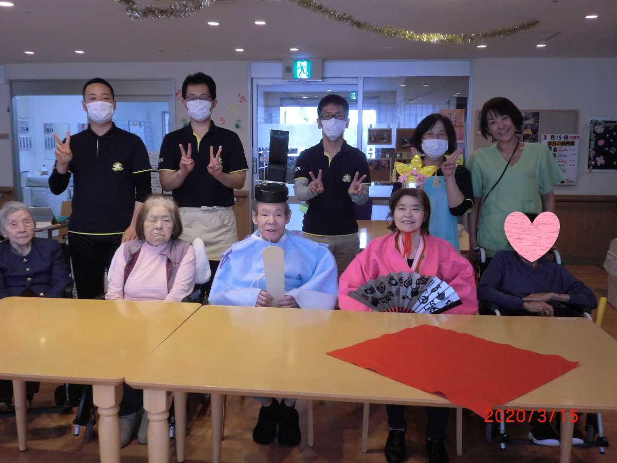 さて、みんなの家・志木上宗岡では 毎年恒例のひな祭りレクを3/15に催しました。 お内裏様とおひな様、二人並んですまし顔~♪の如く、 ご利用者様方々の記念撮影です。