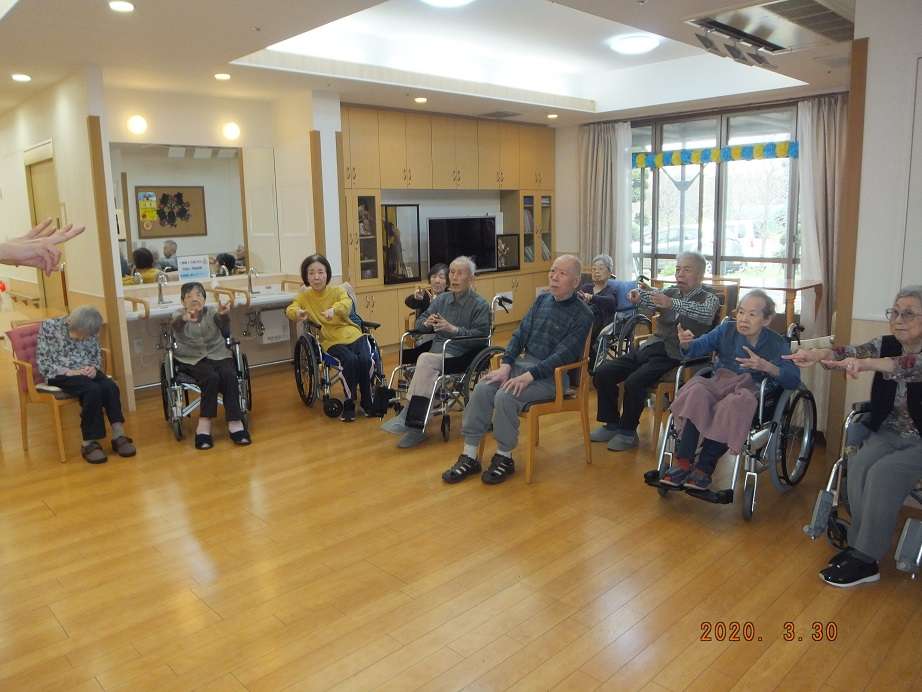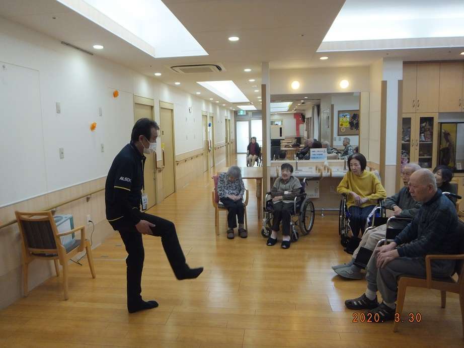 毎月、アルソックの体操を行っています。今月は脳と足の体操NoA体操を行いました。