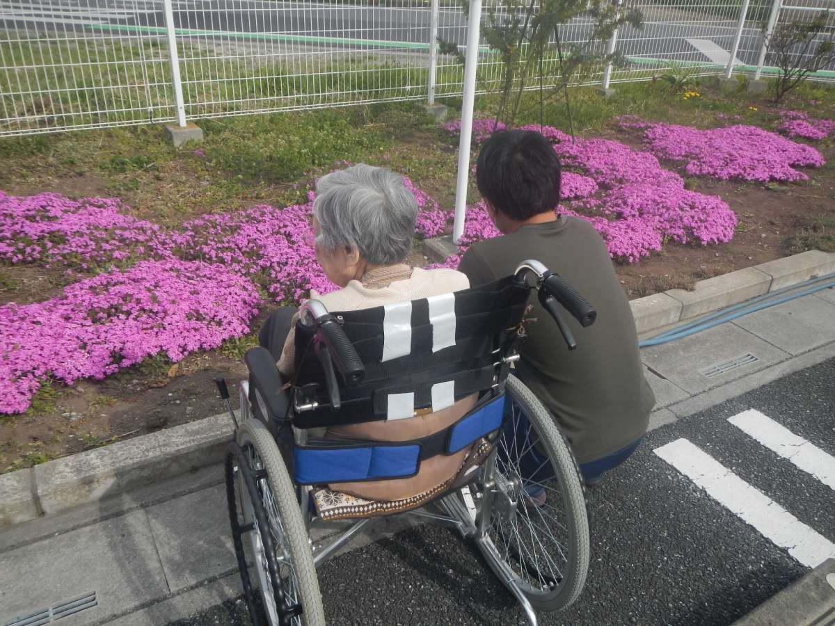 芝桜の鮮やかなピンク色も、おかめ桜との饗宴で、ご利用者様をさらに魅了していました。