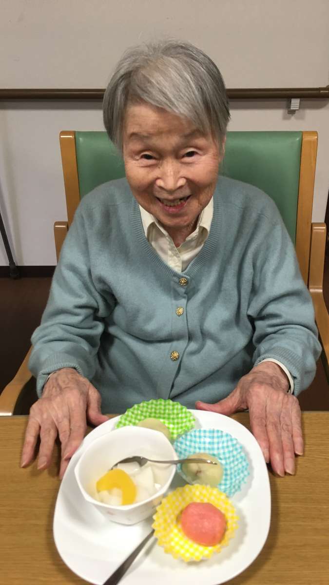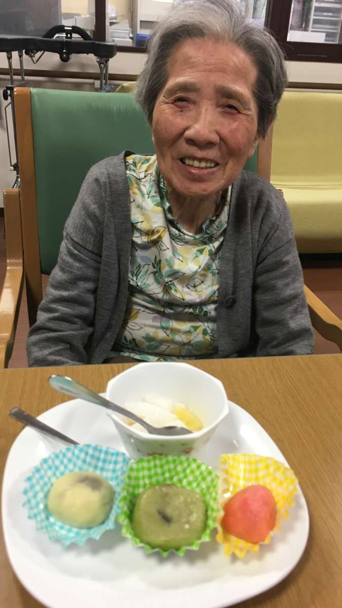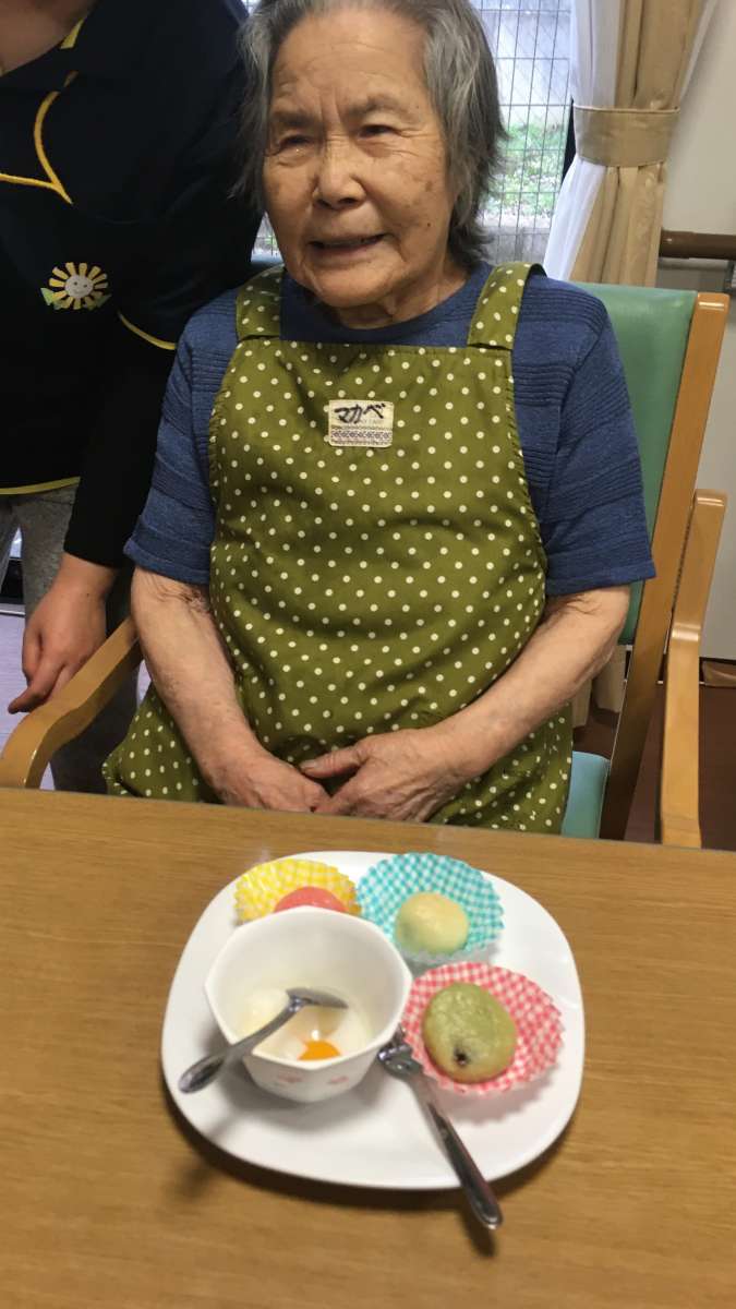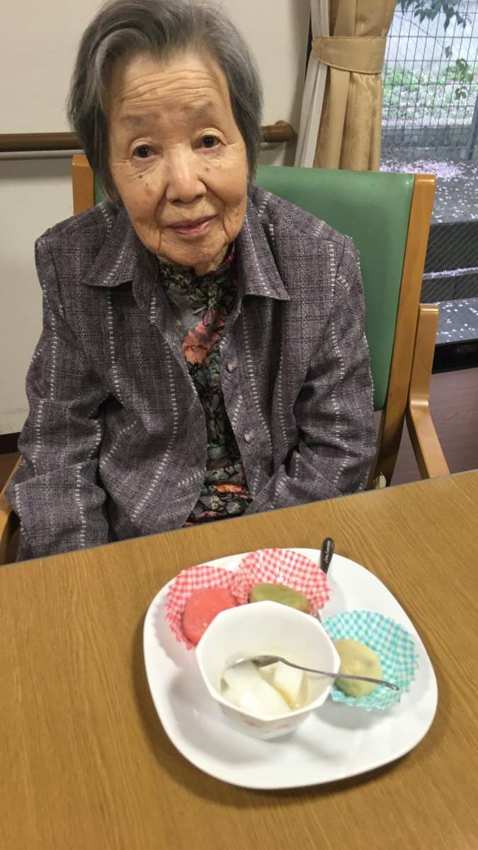 3色のお団子ができあがりました!!それと杏仁豆腐♡♡なんていい笑顔♡(´∀`)♡