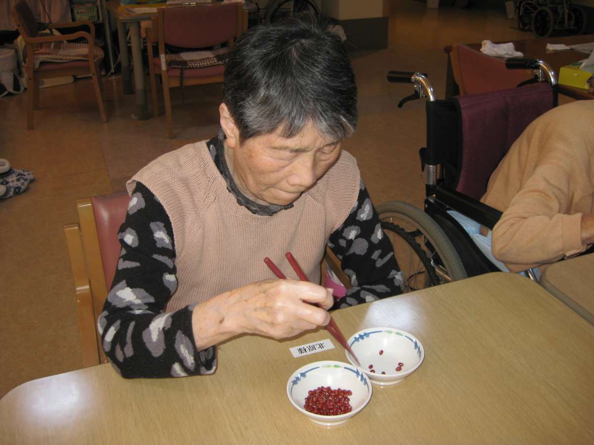 かるたの他、“あずき拾いゲーム”です。「ツルツル滑って取れないよーッ!」