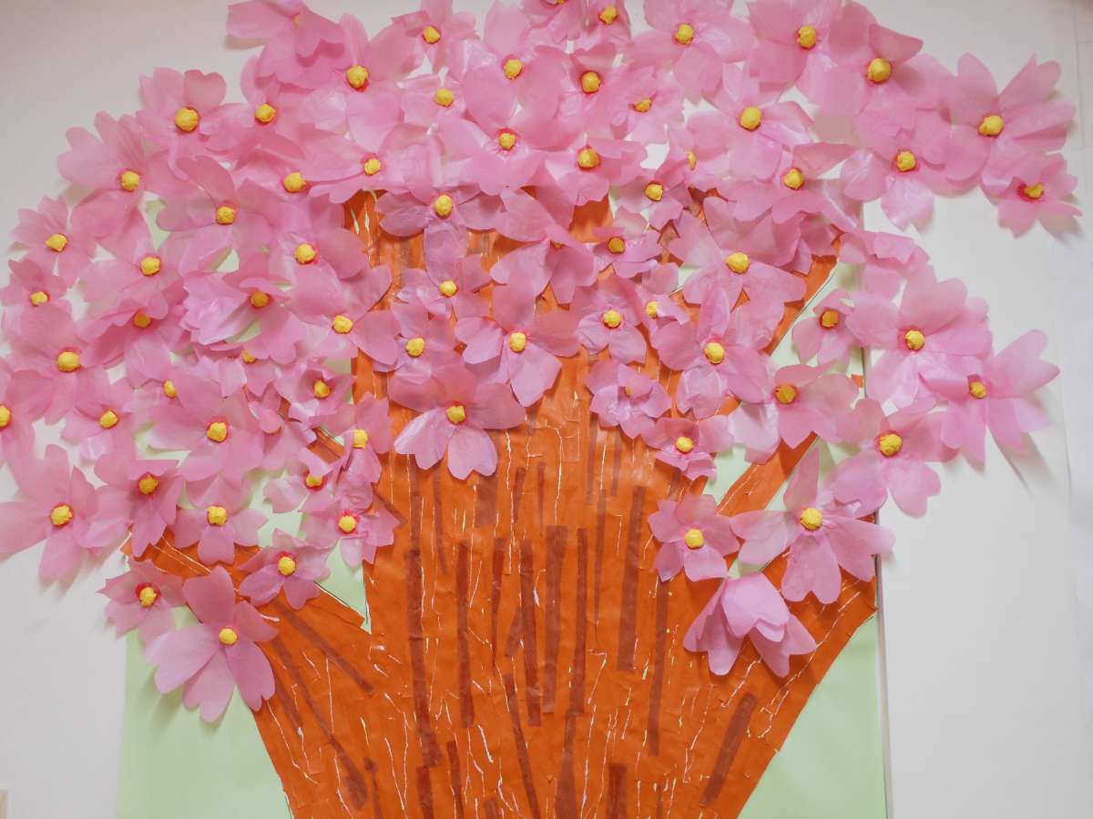 グループホームみんなの家・戸田では、 ご利用者様と職員で桜を作りました。毎日、フロアの桜を満開にしようと折り紙とお花紙で制作し