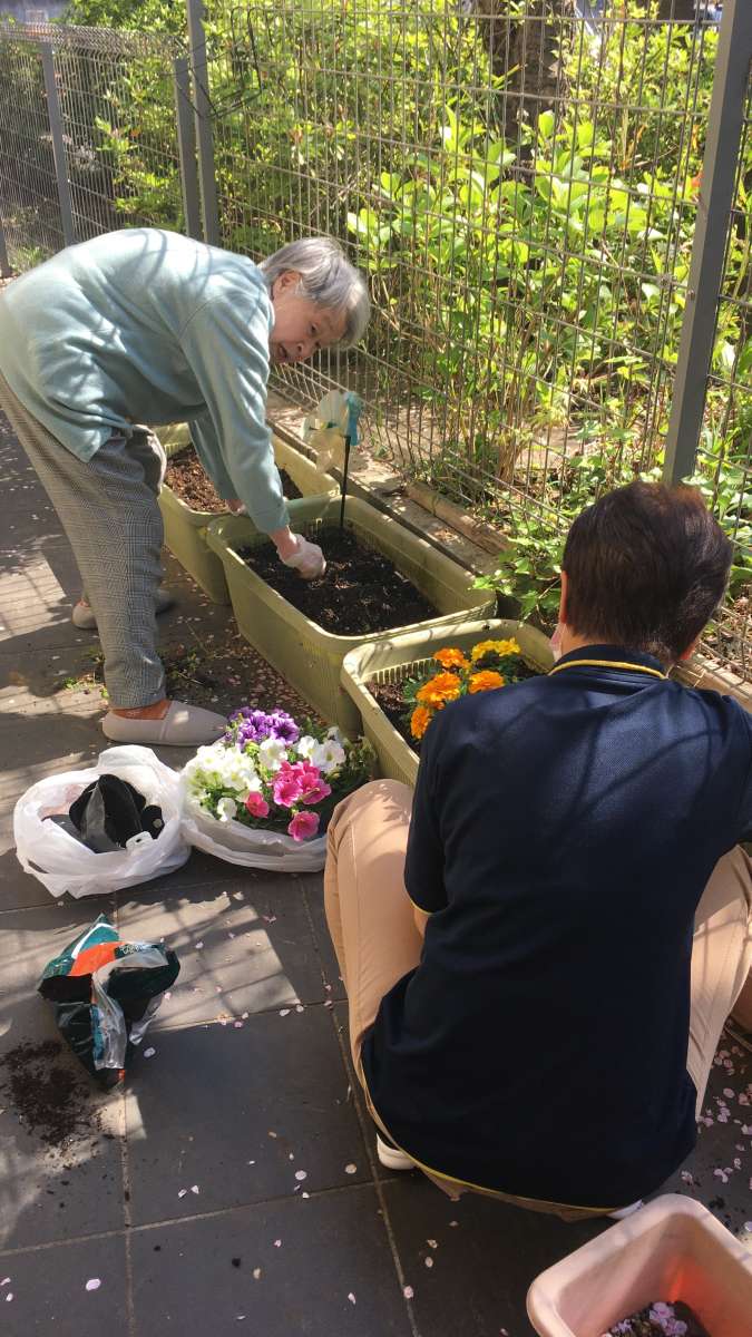 お花を植えて、お庭のお掃除をしました♪