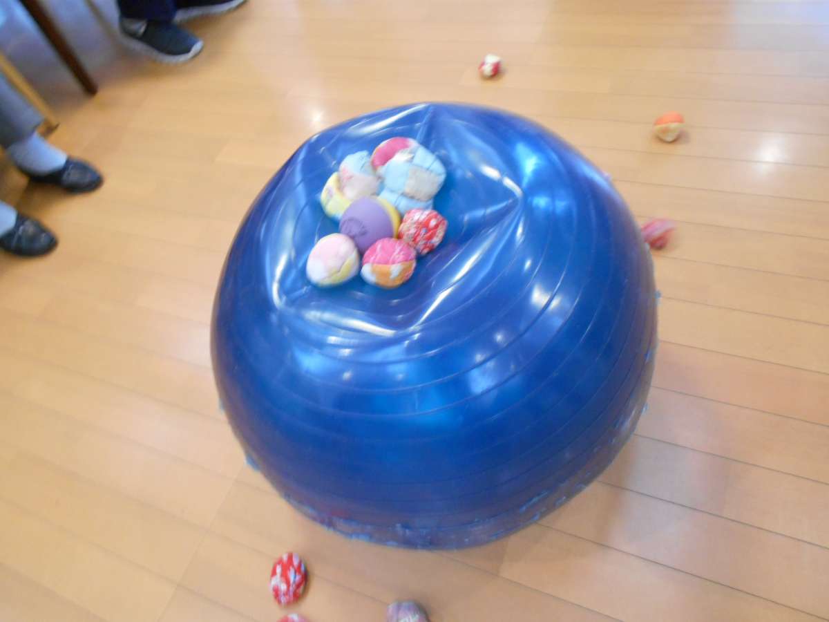 大きいバランスボールの上にお手玉をちょんちょん投げて、