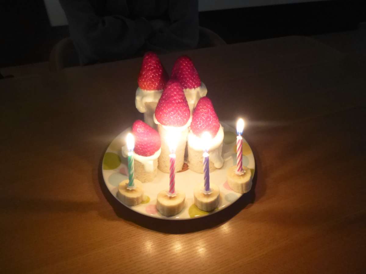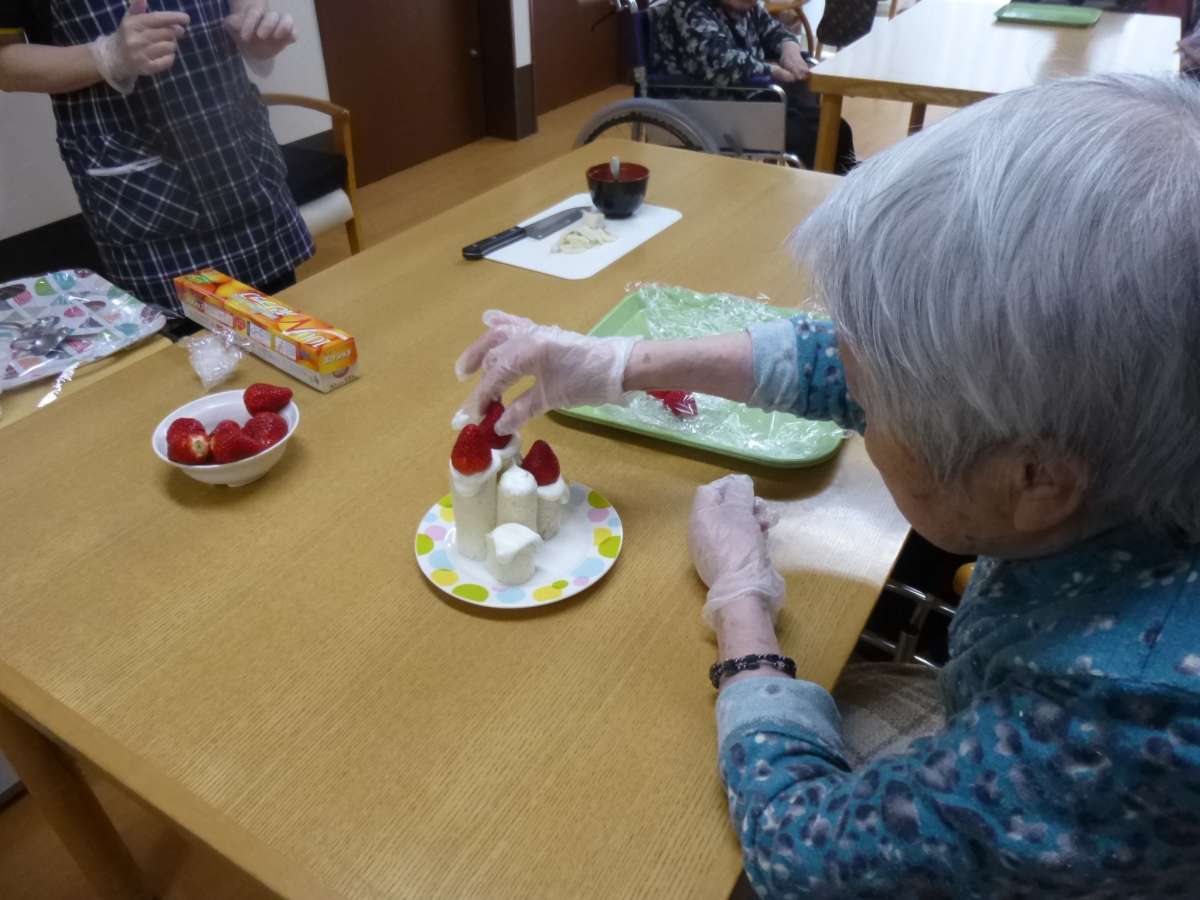 巻いたパンに、生クリームを塗って、イチゴをトッピング。