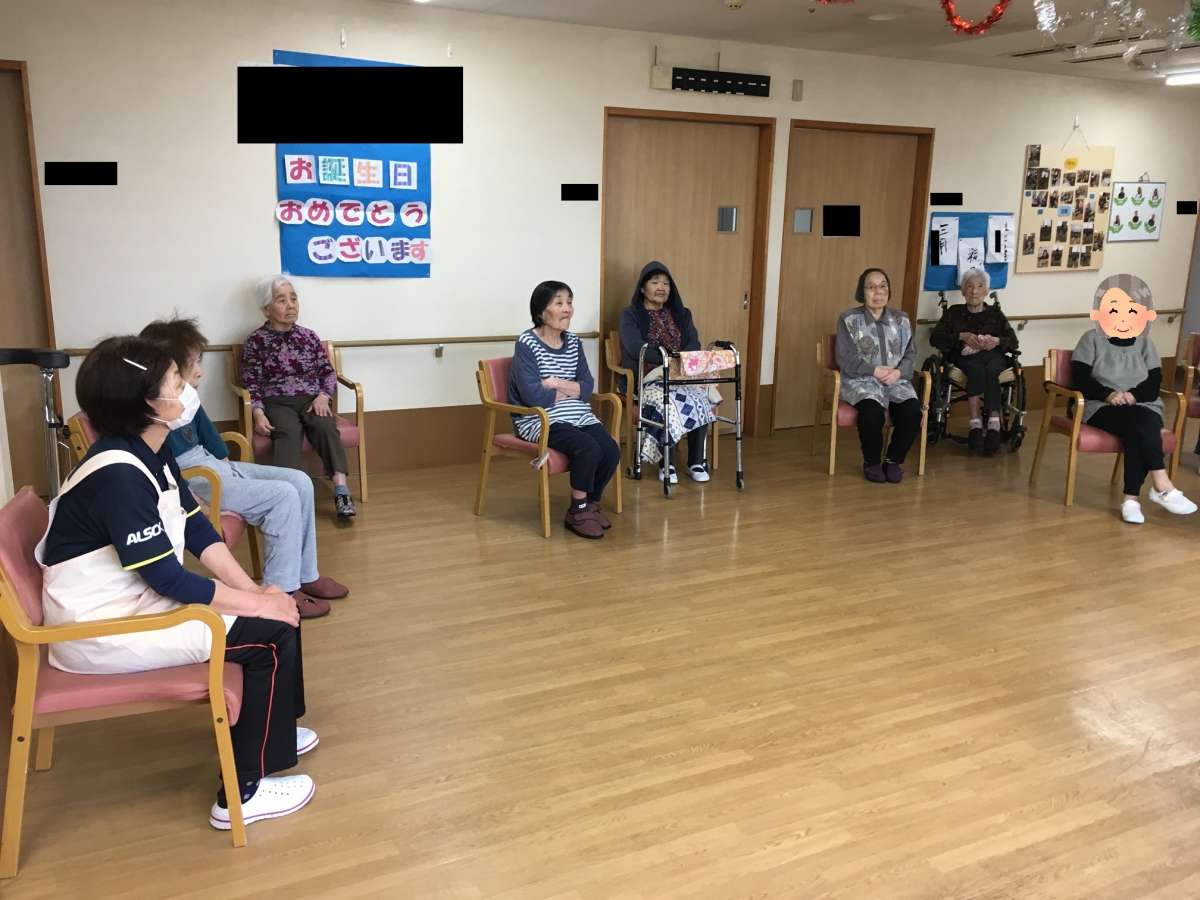 普段は各フロアの皆様に集まって頂いて行うのですが、ウイルスの件で1Fは1Fフロアの利用者様のみ、2Fフロアの東・西フロアは東フロアに集まり、なるべく隣同士近づきすぎないよう椅子を離して配置しております。
