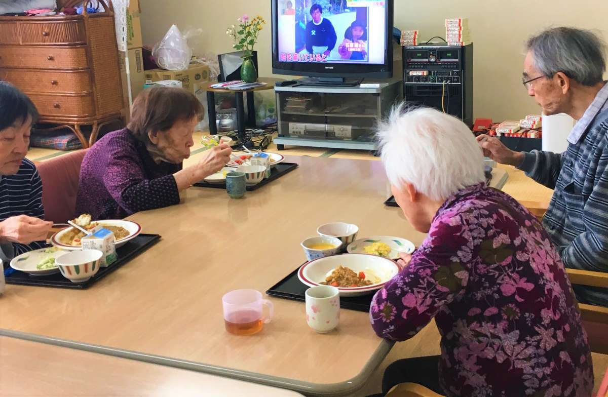一見和やかなお食事の風景ですが、カレーライスなのに箸を持っていらっしゃる左奥のH様…