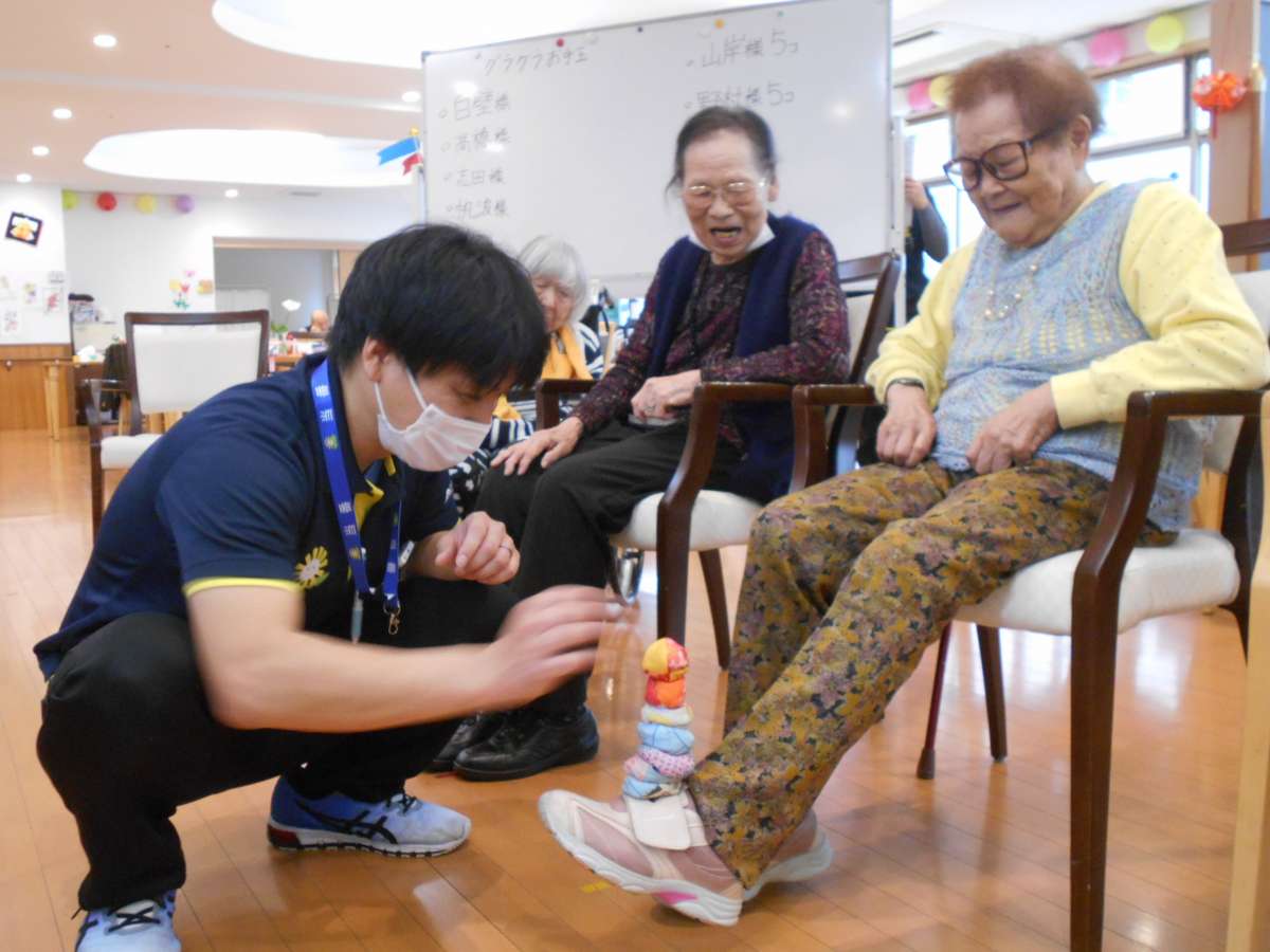 片足を床から離して、お手玉を足の甲に7個積んでいきます。